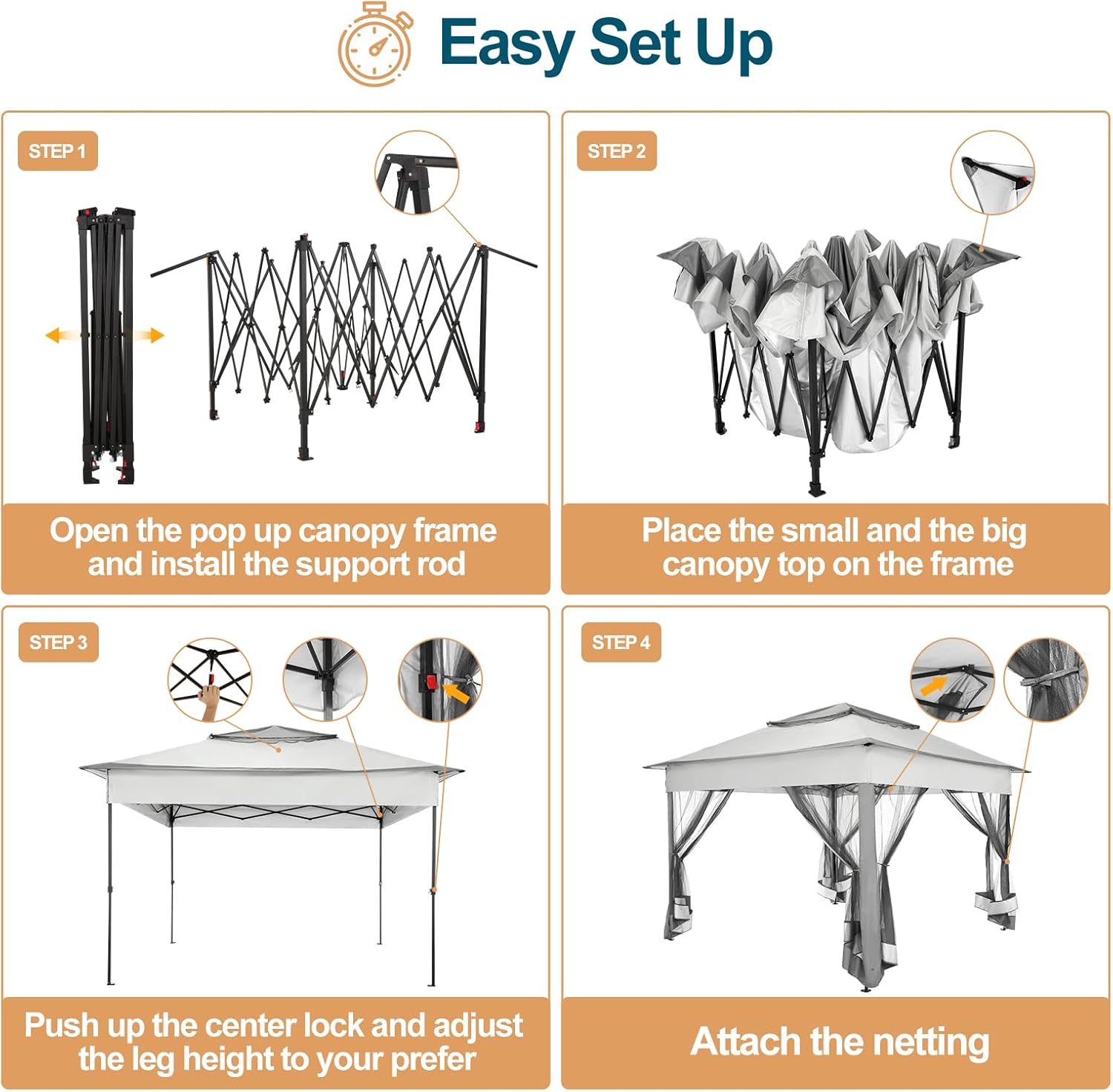 Eenvoudig te monteren en meerdere toepassingen: de draagbare gazebo van 3 x 5 meter bevat pop-up vouwbeugels en is zeer eenvoudig te monteren, slechts 5 minuten aan 2 volwassenen om op te zetten. Onze achtertuintuintuintent heeft ook drie verstelbare hoogtes, zodat je kunt genieten van de tijd onder verschillende gelegenheden. Je kunt onze gazebo gebruiken voor achtertuin, tuin, patio's, feesten, bruiloften, tuinen, enz.