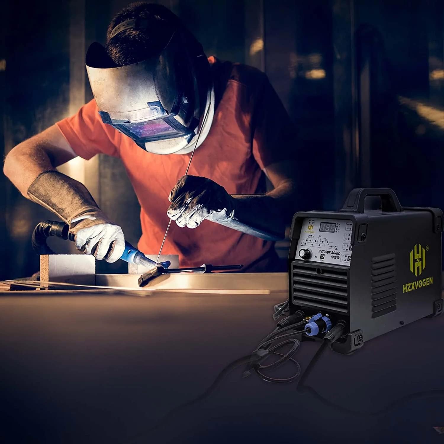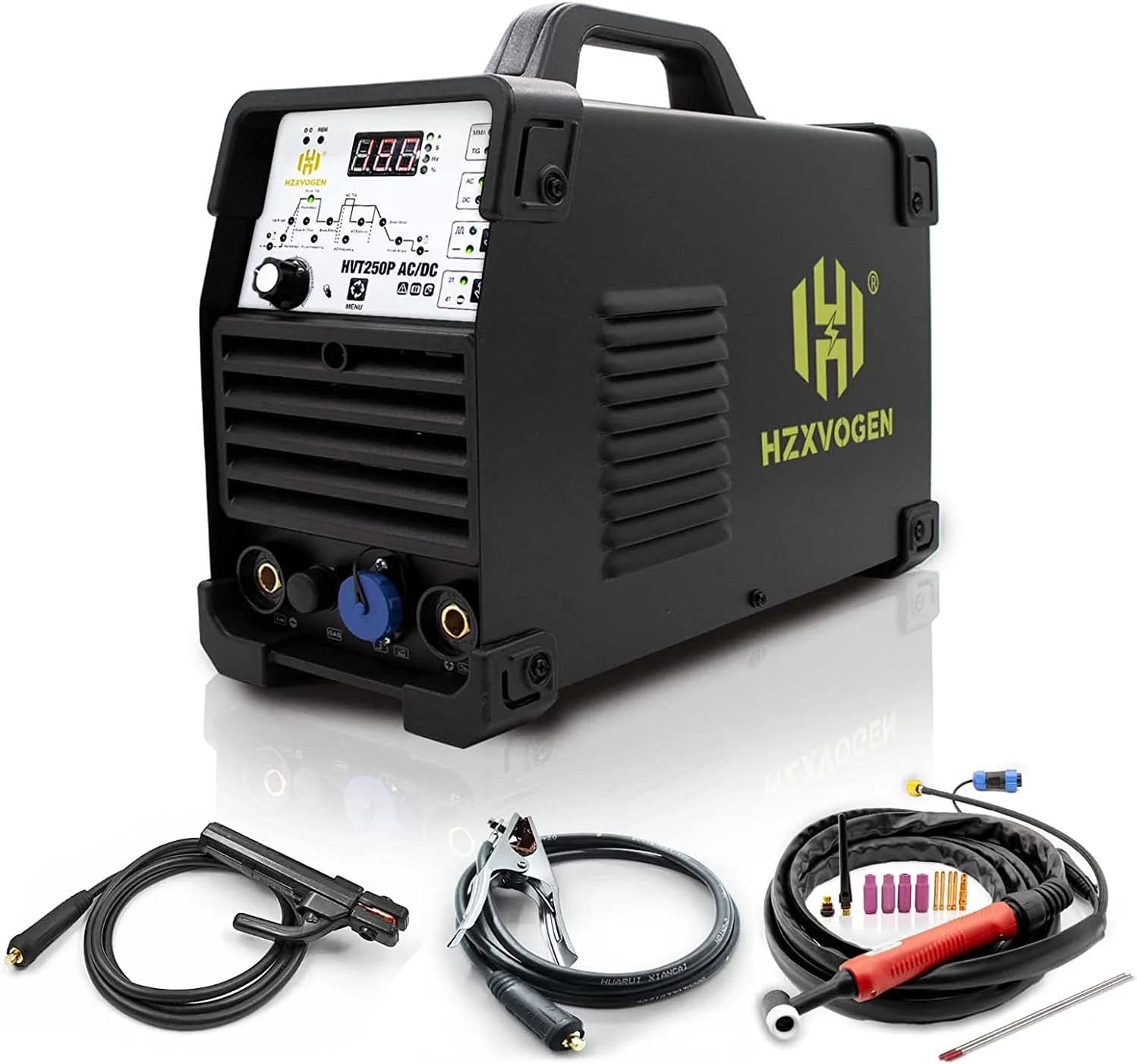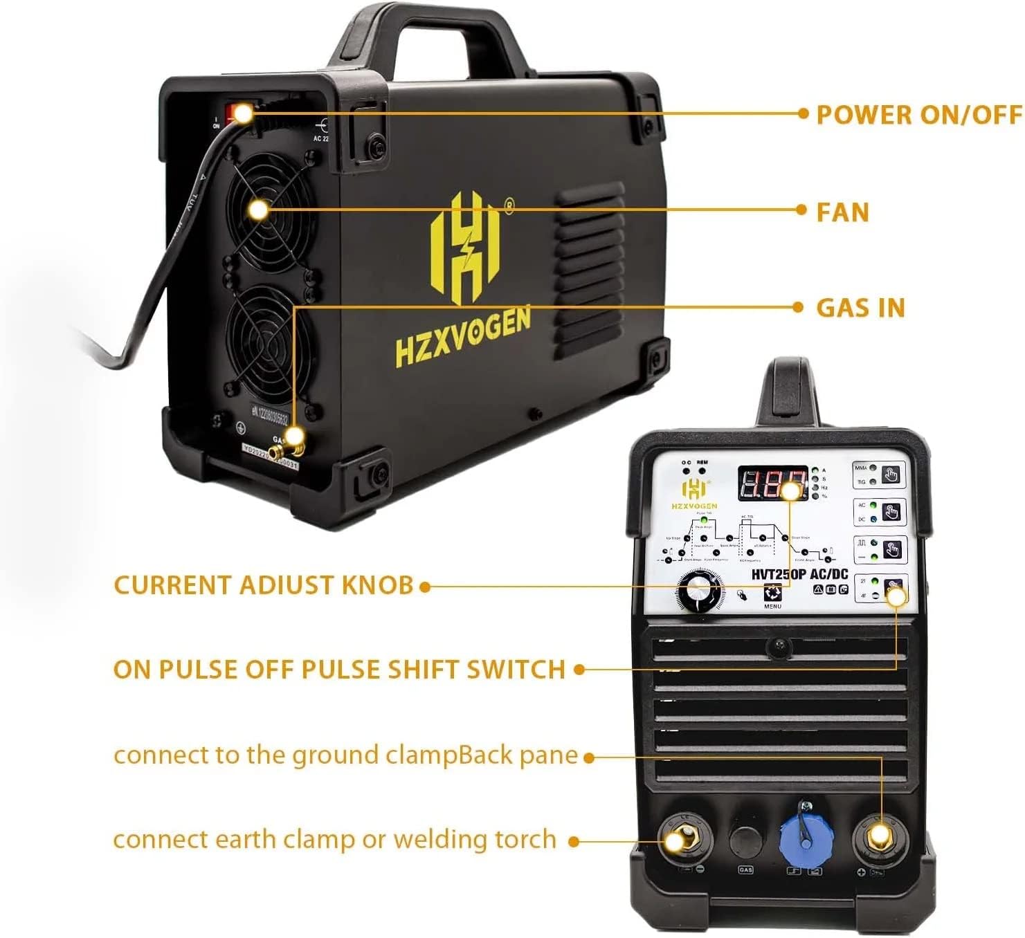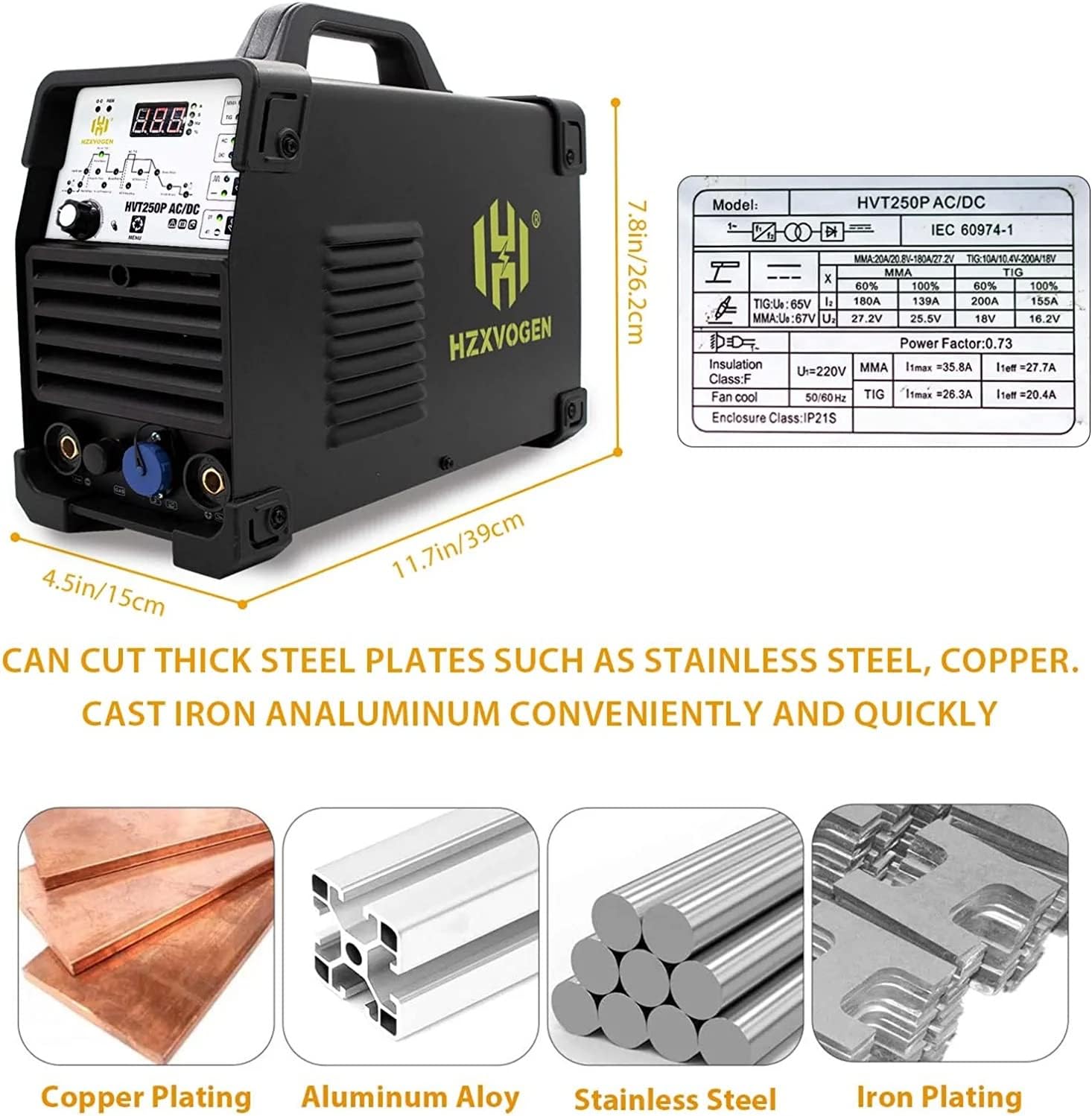 - PROFESSIONEEL AC DC PULS ALUMINIUM TIG LASSEN - Digitaal pulsgestuurd frequentiebereik: 0,5-200 Hz en AC-gestuurde pulsfrequentie: 0,5-200 Hz, AC-inschakelduurbereik: 10-90%, kan ultradunne aluminiumplaten van 0,3 mm lassen.