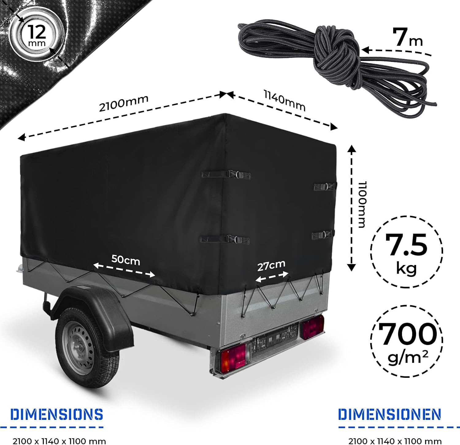 Veilig aanhangerzeil met pvc-coating: duurzaam en onderhoudsvriendelijkBelangrijkste kenmerken: waterdicht en bestand tegen rotting en schimmel. Moeiteloos transportgrootte: 2070 x 1140 x 1100 mm