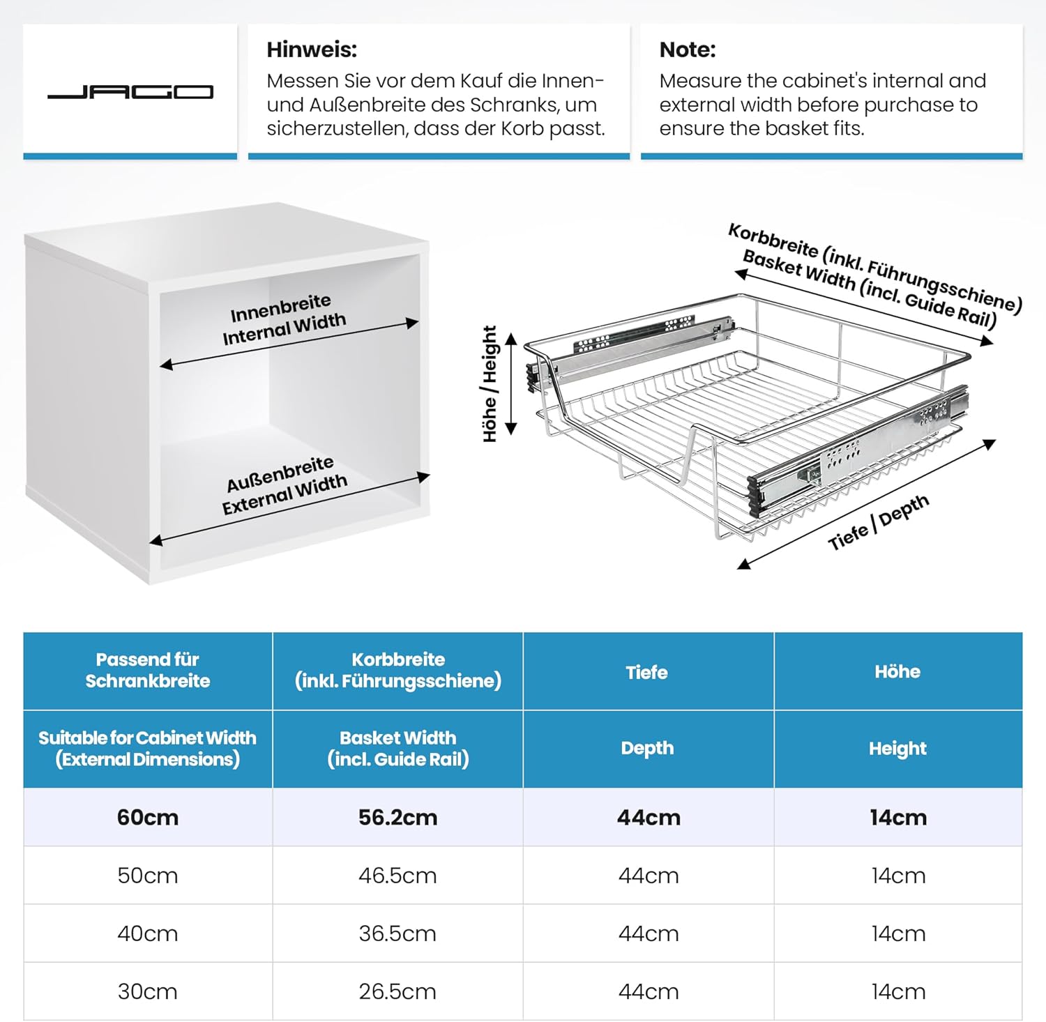 - Afmetingen: De mand is voorzien van telescooprails en is past in kasten van 30, 40, 50 of 60 cm breed.