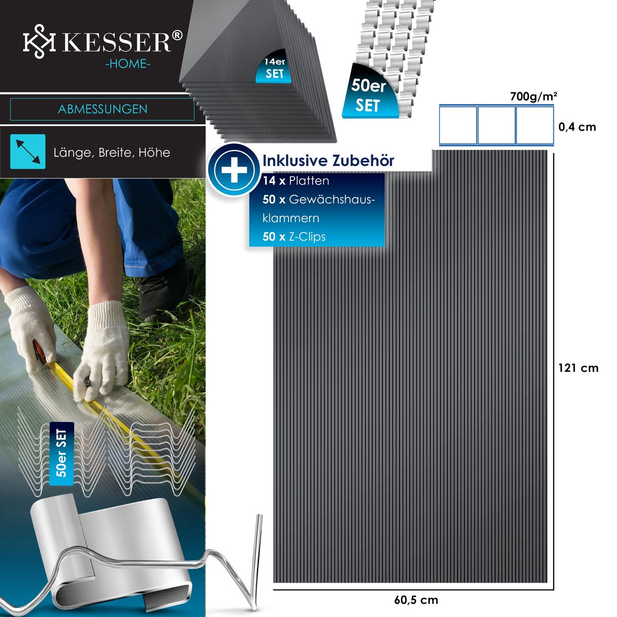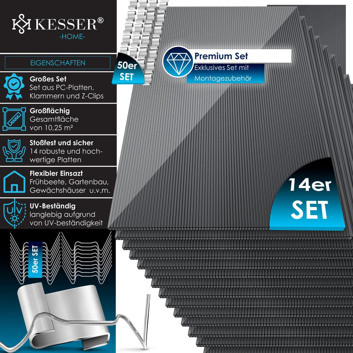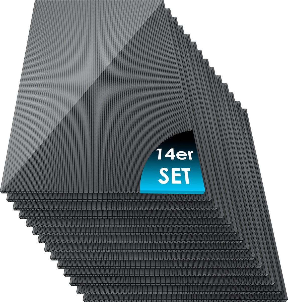 KESSER® 14x Polycarbonaat Dubbelwandige Platen 4mm | 10,25 m² Dubbelwandige Plaat - 1210x605 | 50x Klemmen + 50x Z-Clips | Dubbelwandige Plaat UV-bestendig voor Kas Tuinbouw Carports