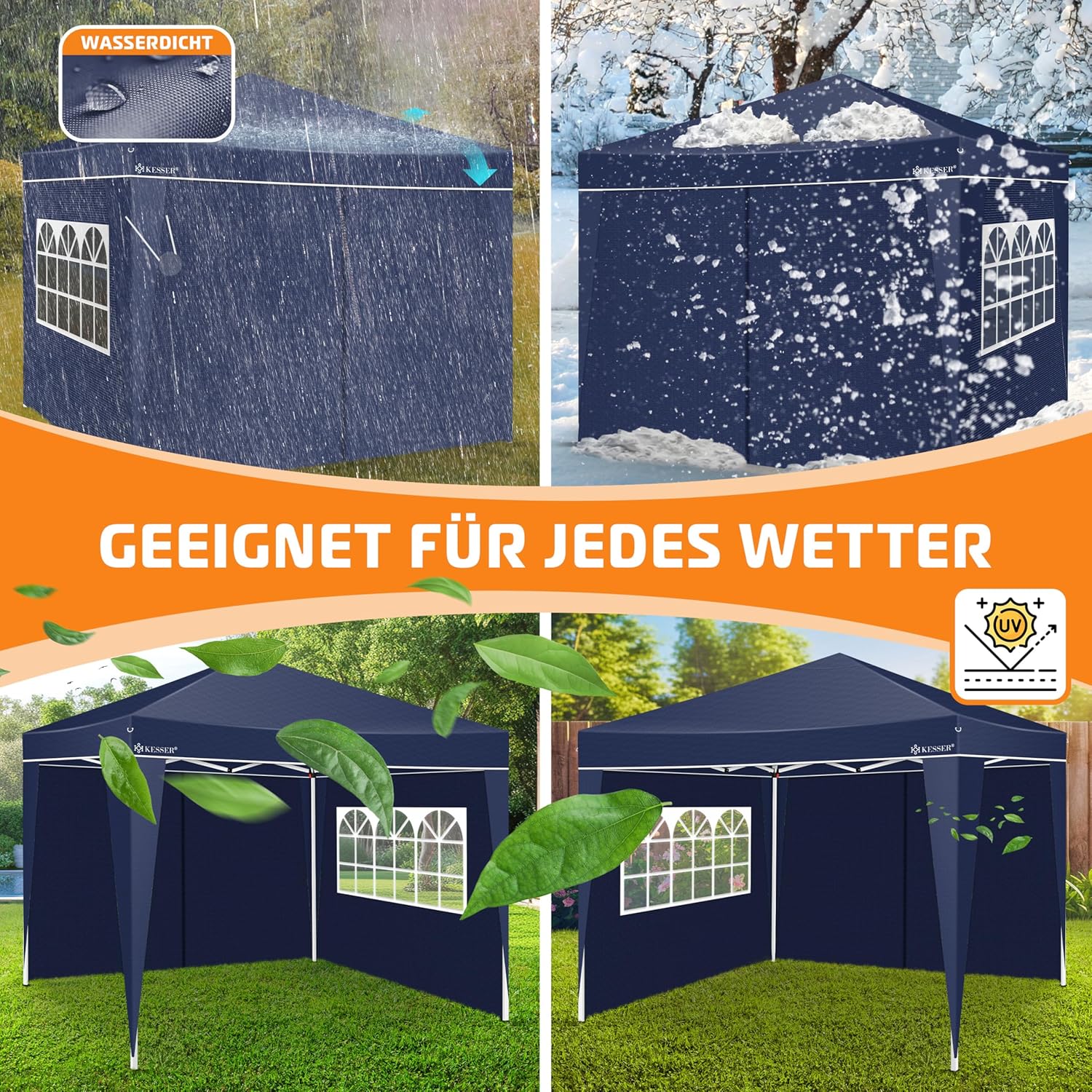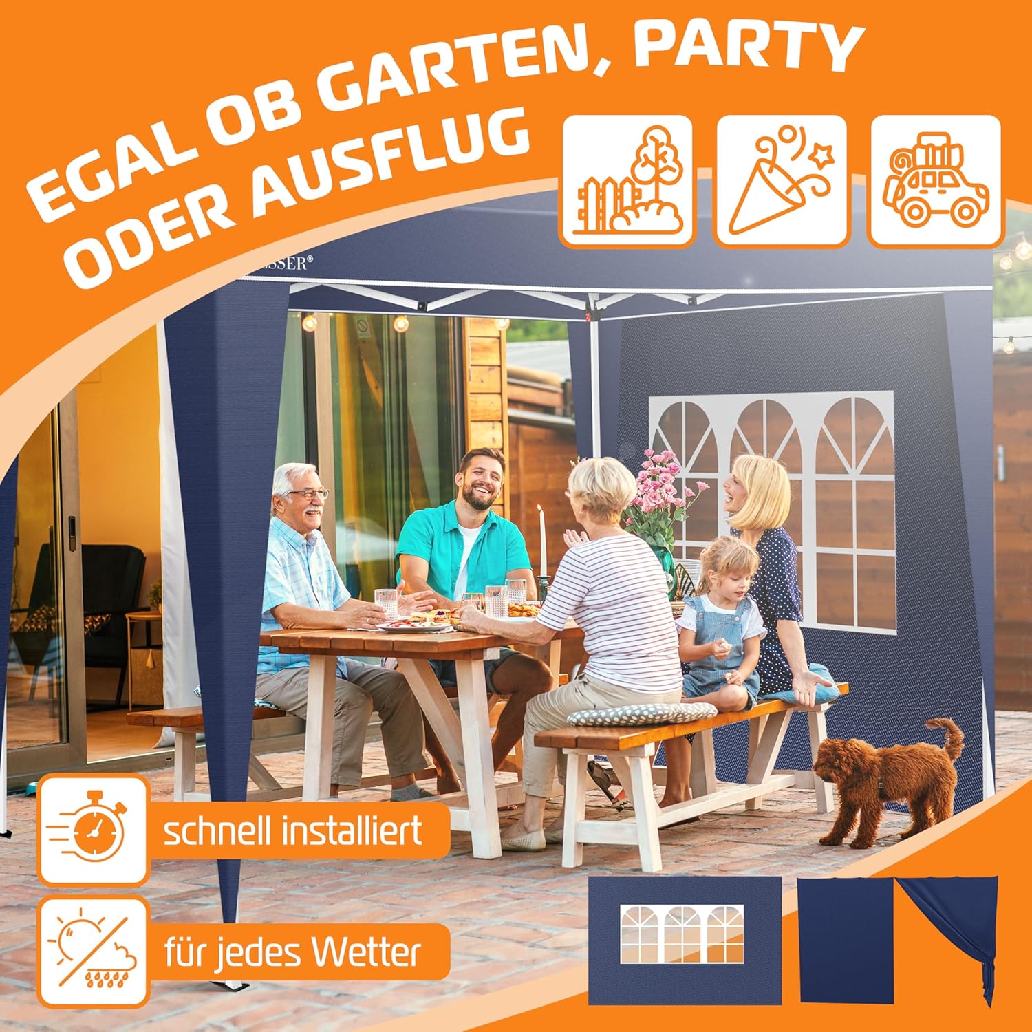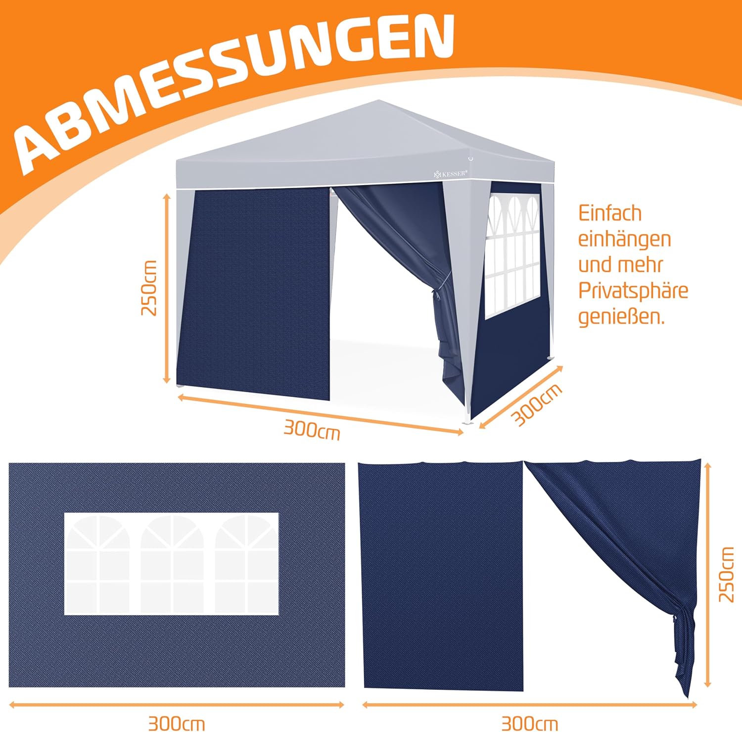 Geef uw paviljoen dat beetje extraen upgrade het met onze hoogwaardige en moderne zijwanden . De praktische zijwanden met ritssluiting en 3-delig zijraam kunnen snel en eenvoudig aan uw paviljoen worden bevestigd . Dit betekent dat u de zomer ontspannen in de tuin of op het terras kunt doorbrengen en beschermd bent tegen sterke zonnestralen en hinderlijke wind . De bovenste dakbedekking is gemaakt van de waterafstotende samenstelling 220D Oxford - 100% polyester en heeft een UV-bescherming 50+ . Dankzij de materiaalsamenstelling kunnen de zijwanden na één zomerseizoen eenvoudig met water worden gereinigd , wat betekent dat de paviljoenwanden jaar na jaar als nieuw stralen . Eén zijwand is voorzien van een ritssluiting , zodat u een mogelijke in- en uitgang heeft . Door de ritssluiting snel en eenvoudig te openen , kan er probleemloos frisse lucht naar binnen stromen . Indien nodig kunt u de paviljoenwand eenvoudig terugbinden met de bevestigingsbanden of gemakkelijk weer sluiten . Onze KESSER zijwanden zijn bijzonder geschikt voor beurzen , tuinfeesten , buitensporten , barbecues met familie en vrienden , kampeervakanties of andere buitenactiviteitenDankzij hun hogeduurzaamheid kunnen de zijwanden onder andere wordengebruikt in tuinen , binnenplaatsen , terrassen , stranden , boerderijen en commerciële gebieden. Het privacyscherm van het prieel kan snel en eenvoudig worden opgezet en afgebroken . Als u het langere tijd niet gebruikt , kunt u de zijkanten eenvoudig opvouwen en opbergen om ruimte te besparen . Veiligheidswaarschuwing : Verwijder de zijkanten om schade te voorkomen bij langdurige regen, hevige regenval of stormachtig weer. Laat ze niet 's nachts geïnstalleerd staan. Klimaatgerelateerde stormen, windkrachten, onweersbuien en windstoten kunnen het artikel beschadigen.