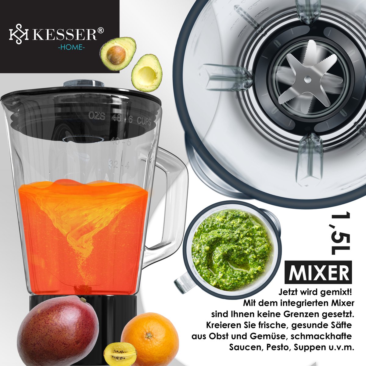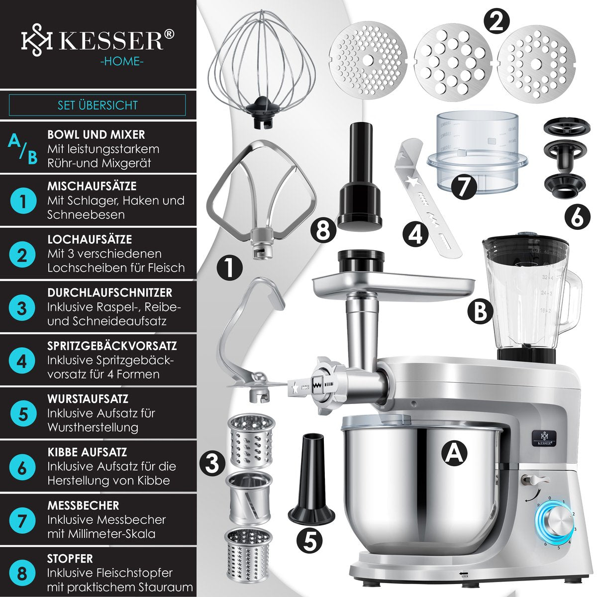 KESSER Premium keukenmachine van robuust en roestvrij staal, krachtige 1500 watt motor van zuiver koper, LED-verlicht snelheidsdisplay, 6-staps regelaar en pulseerfunctie, incl. haak, roerstaaf en klopper en tevens hakmolen, spiraalsnijder en blender.