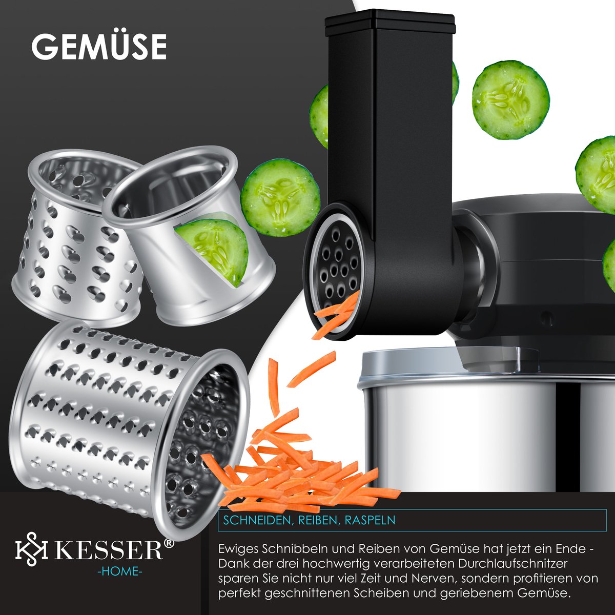 Dankzij de groentespiraalsnijder maak je in een handomdraai de heerlijkste salades en groentebijgerechten en verwen je jezelf en je geliefden. Je bespaart veel tijd en de maaltijden zien eruit alsof ze uit een restaurant komen. Het eeuwige hakken en raspen van groenten behoort nu tot het verleden. Dankzij de hoogwaardig verwerkte doorslijper bespaar je niet alleen tijd en zenuwen, maar profiteer je ook van perfect gesneden plakjes en geraspte groenten.