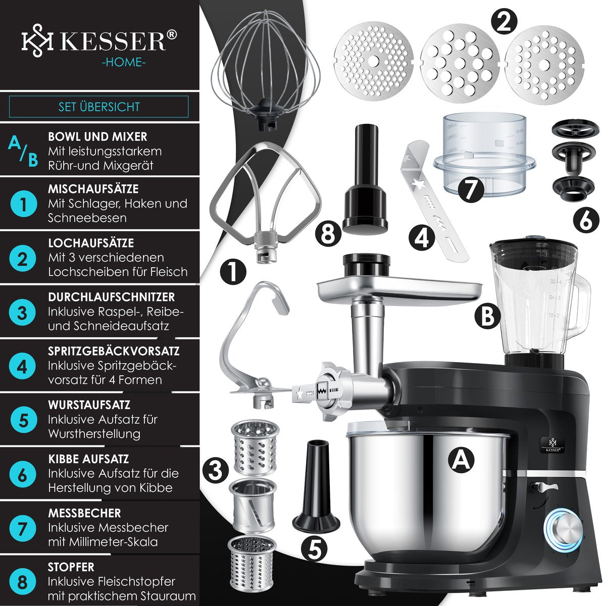 KESSER Premium keukenmachine van robuust en roestvrij staal, krachtige 1500 watt motor van zuiver koper, LED-verlicht snelheidsdisplay, 6-staps regelaar en pulseerfunctie, incl. haak, roerstaaf en klopper en tevens hakmolen, spiraalsnijder en blender.