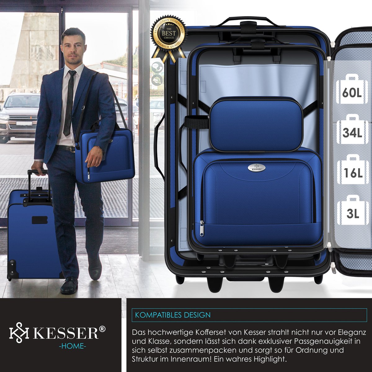 Dankzij de tweewegritssluiting kan de koffer snel en eenvoudig aan beide kanten van de ritssluiting worden geopend en gesloten. Met de verstelbare veiligheidsriemen kun je ook je handbagage aan de koffer vastmaken en zo perfect vervoeren, zonder dat je nog een stuk bagage hoeft mee te nemen. Profiteer van uitstekende kwaliteit en veilig vakmanschap met de kofferset van KESSER .