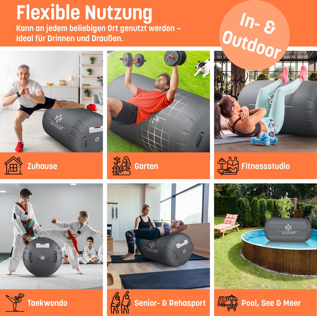 BESTAND EN DUURZAAM: Met een indrukwekkende belastbaarheid van 200-300 kg en een dikke UV- en waterbestendige PVC-materiaal blijft de KESSER Airrolle zelfs na 72 uur stevig opgeblazen. Dit garandeert duurzaamheid en blijvende prestaties, ongeacht de intensiteit van uw oefeningen.
