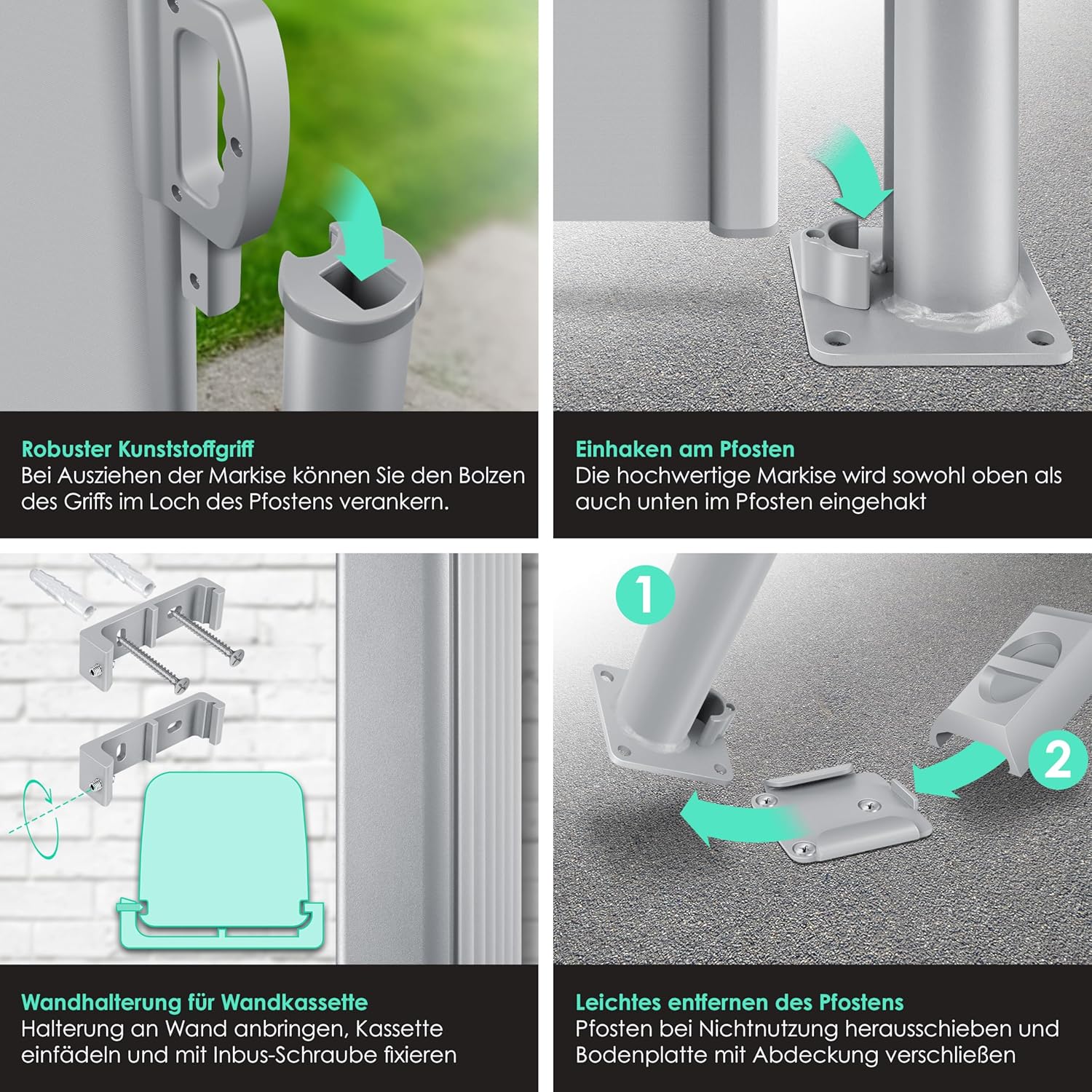 Gemakkelijk te gebruiken: de bediening van de zijluifel is zeer eenvoudig. Robuuste kunststof handgrepen maken moeiteloos uittrekken en fixeren mogelijk. De haak boven en onder in de paal garandeert een veilige bevestiging. Bij niet-gebruik kan de paal gemakkelijk worden verwijderd en kan de bodemplaat met een afdekking worden afgesloten.
