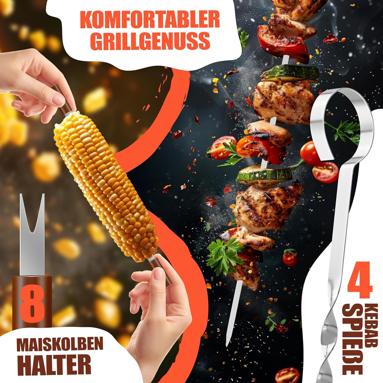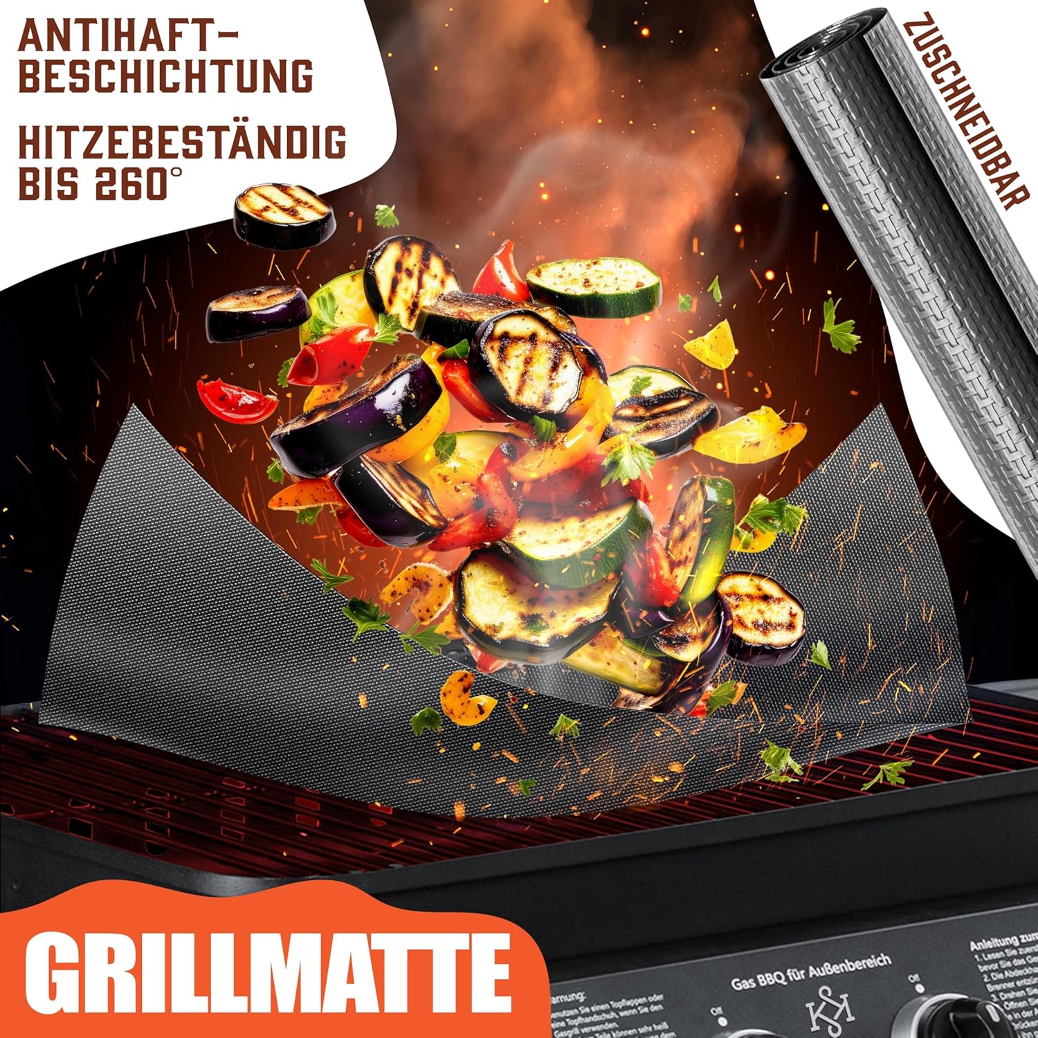 Geïntegreerde grillmat en praktische BBBC-houder: de hittebestendige teflon-grillmat (tot 260 °C) beschermt je grillrooster, voorkomt plakken en maakt vetarm grillen mogelijk. Dankzij 8 maïskolvenhouders en 4 kebab-spiesen kun je heerlijke bijgerechten en spiesen perfect bereiden – voor een rondom geslaagde barbecue-ervaring