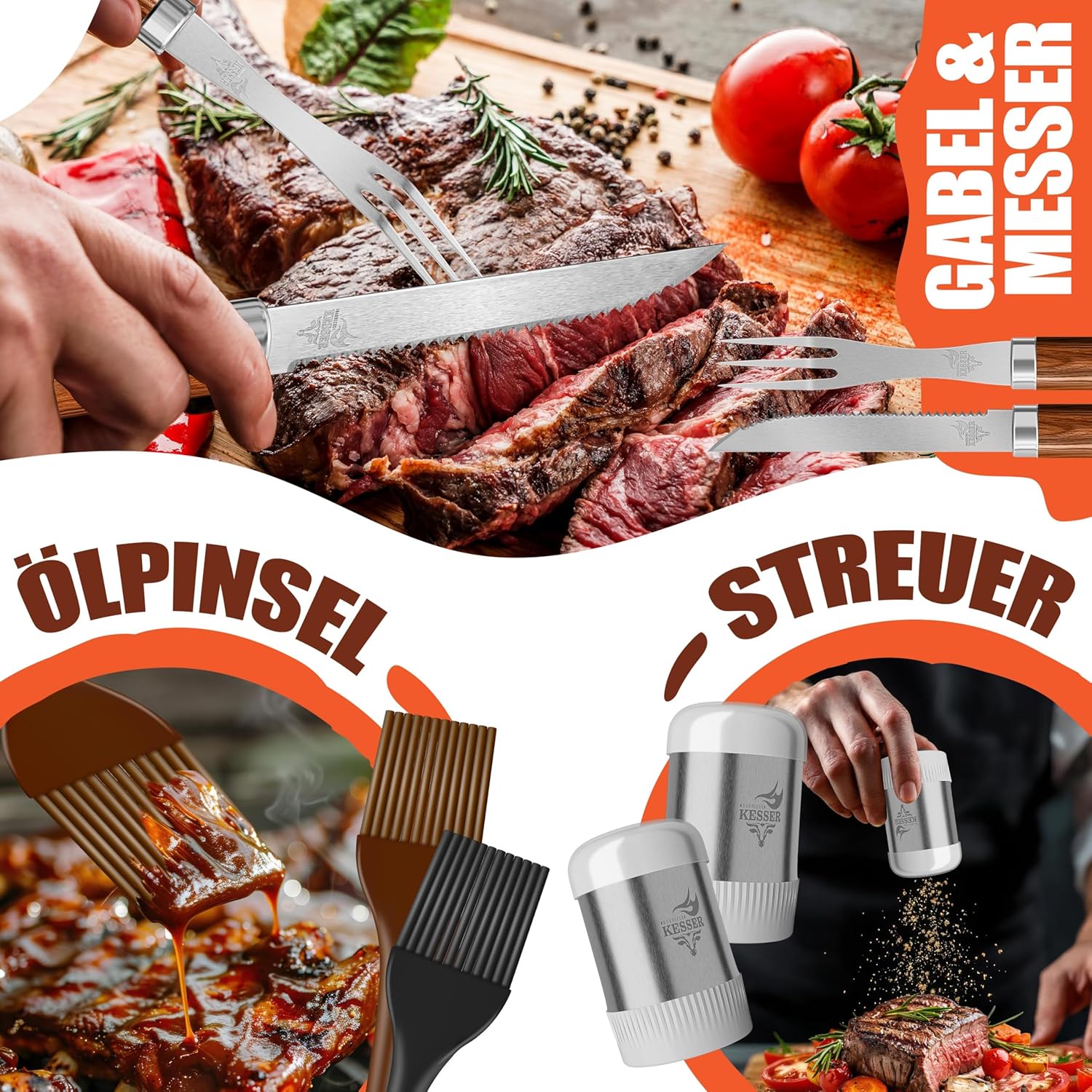 Hoogwaardige kwaliteit: de hele barbecue-accessoires zijn gemaakt van robuust, roestvrij staal en zijn daardoor bijzonder duurzaam, hittebestendig en vaatwasmachinebestendig. De ergonomisch gevormde handgrepen zorgen voor een aangenaam gebruik, terwijl de grillborstel met reservekop zelfs hardnekkige grillresten verwijdert.