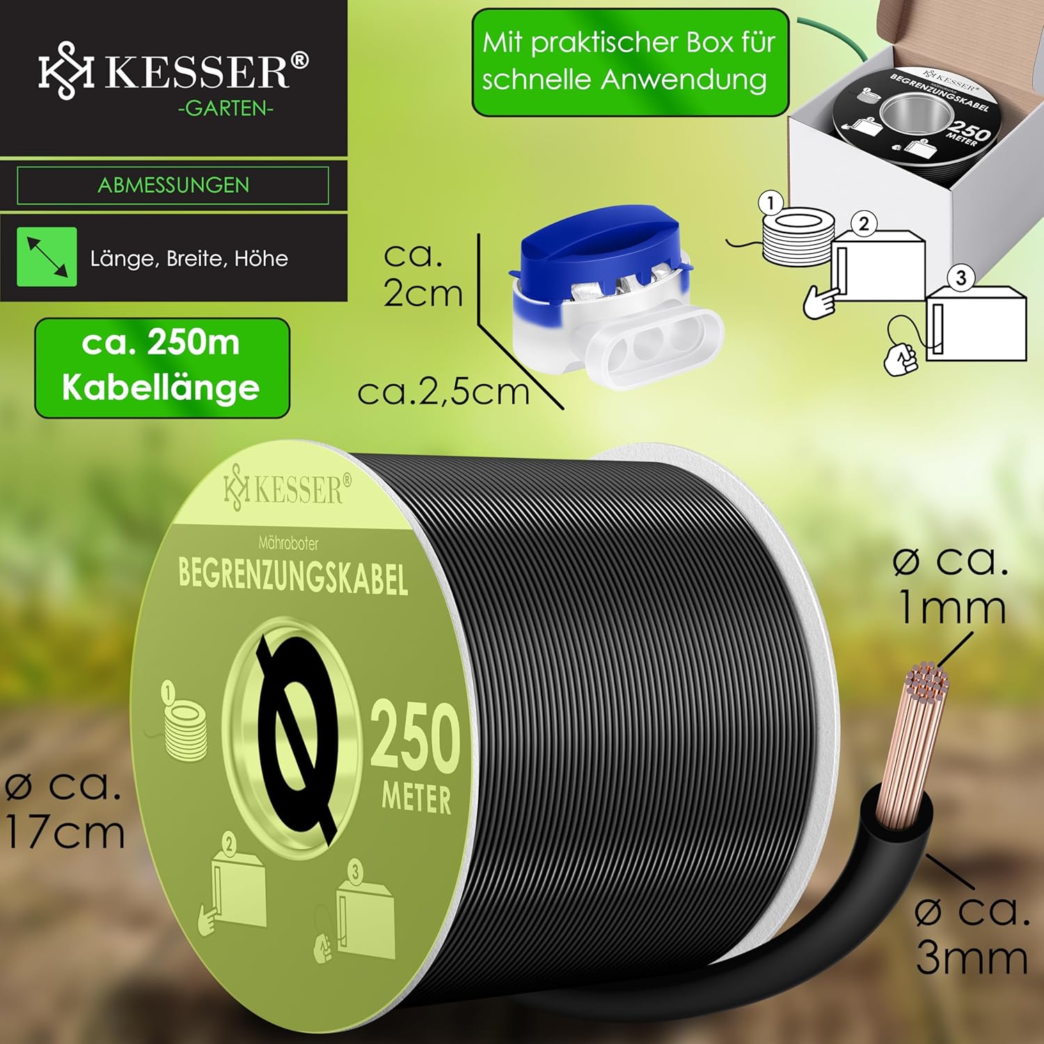 • Robuuste en hoogwaardige materialen: door de hoogwaardige en robuuste materiaalverwerking werkt onze begrenzingskabel als een onzichtbare omheining voor je robotmaaier. Met een diameter van de hoes van slechts 2,7 mm en de binnenkant van 1,17 mm kun je de kabel bijzonder onopvallend in je tuin leggen. Echter, 24 vertinde en koperen gecoate aluminium strengen zorgen voor maximale resultaten.