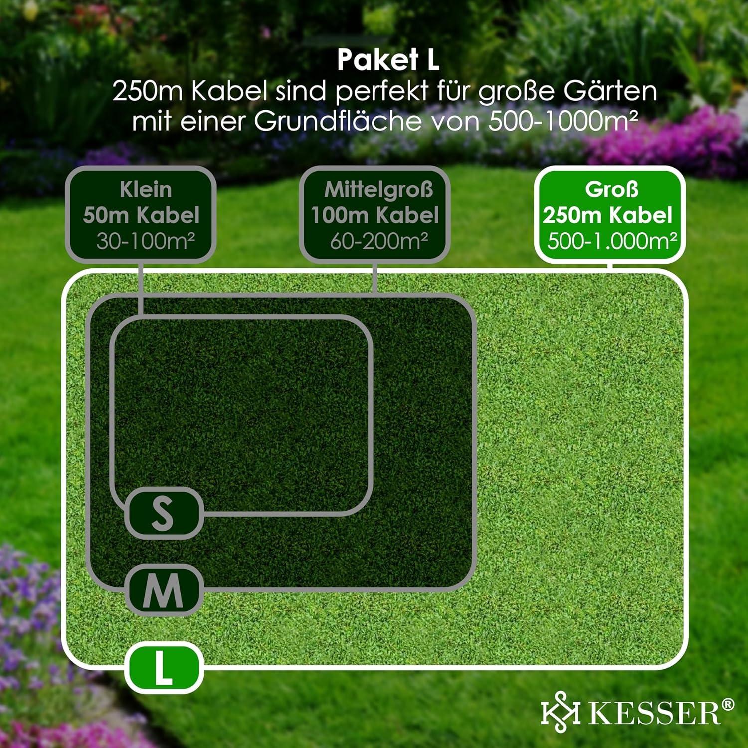 • Grote set: naast het robuuste materiaal profiteert onze kabel door de weerstand tegen vocht en weer. Dankzij de gel kun je de weerbestendigheid nog eens extra bevorderen. Afhankelijk van de gewenste lengte van je draad kun je deze met onze meegeleverde draadsnijder eenvoudig en eenvoudig scheiden. Door het flexibele materiaal kun je de begrenzingskabel schoon en netjes in je tuin leggen en vastzetten.