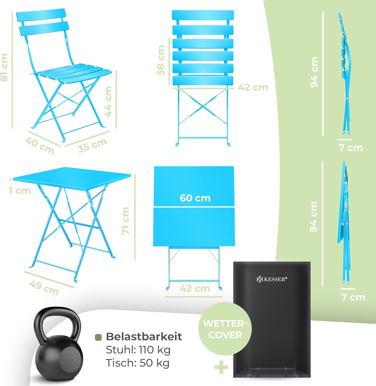 • Weerbestendig en hoogwaardig inzetbaar: gemaakt van gepoedercoat staal, is de set bijzonder robuust, uv-bestendig en waterafstotend. Het stabiele tafelblad is tot 50 kg belastbaar, de stoelen dragen tot 110 kg. Perfect voor langdurig gebruik bij zon, regen of vocht buitenshuis.