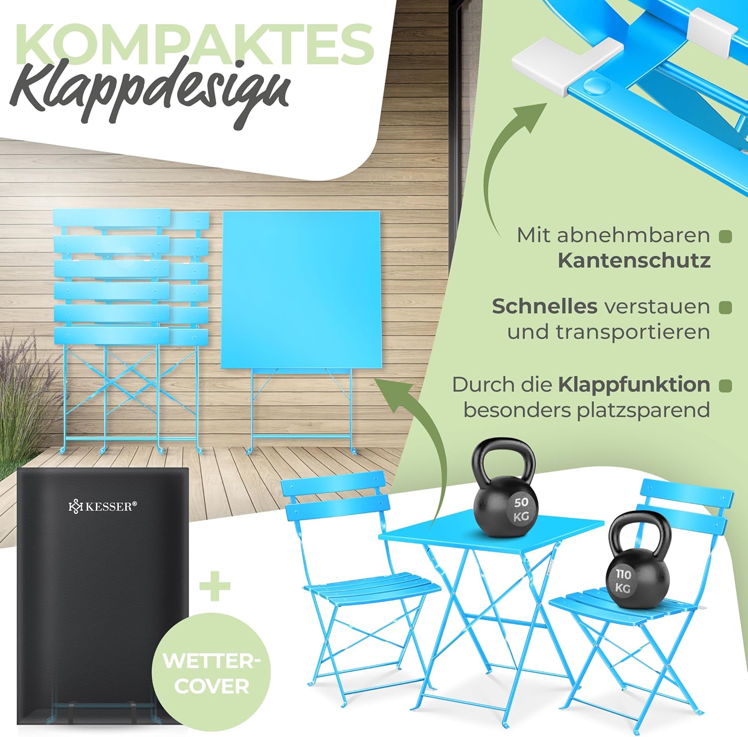 • Ruimtebesparend en snel op te bergen: door het doordachte klapsysteem kunnen tafel en stoelen bijzonder eenvoudig en compact worden opgeborgen. Of het nu voor spontane gasten of seizoensgebonden gebruik is, in enkele seconden opgebouwd of ruimtebesparend opgeborgen. Inclusief afneembare randbescherming en weerbestendige hoes voor optimale bescherming bij niet-gebruik.