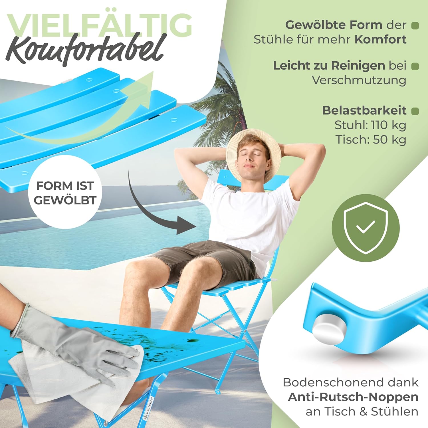 • Comfortabel en bodemvriendelijk: de ergonomisch gebogen zitvorm zorgt voor aangenaam zitcomfort – ideaal voor lange zomeravonden. Anti-slip noppen op de tafel- en stoelpoten beschermen gevoelige vloeren en zorgen voor een stabiele stand, ook op gladde oppervlakken zoals tegels of hout.