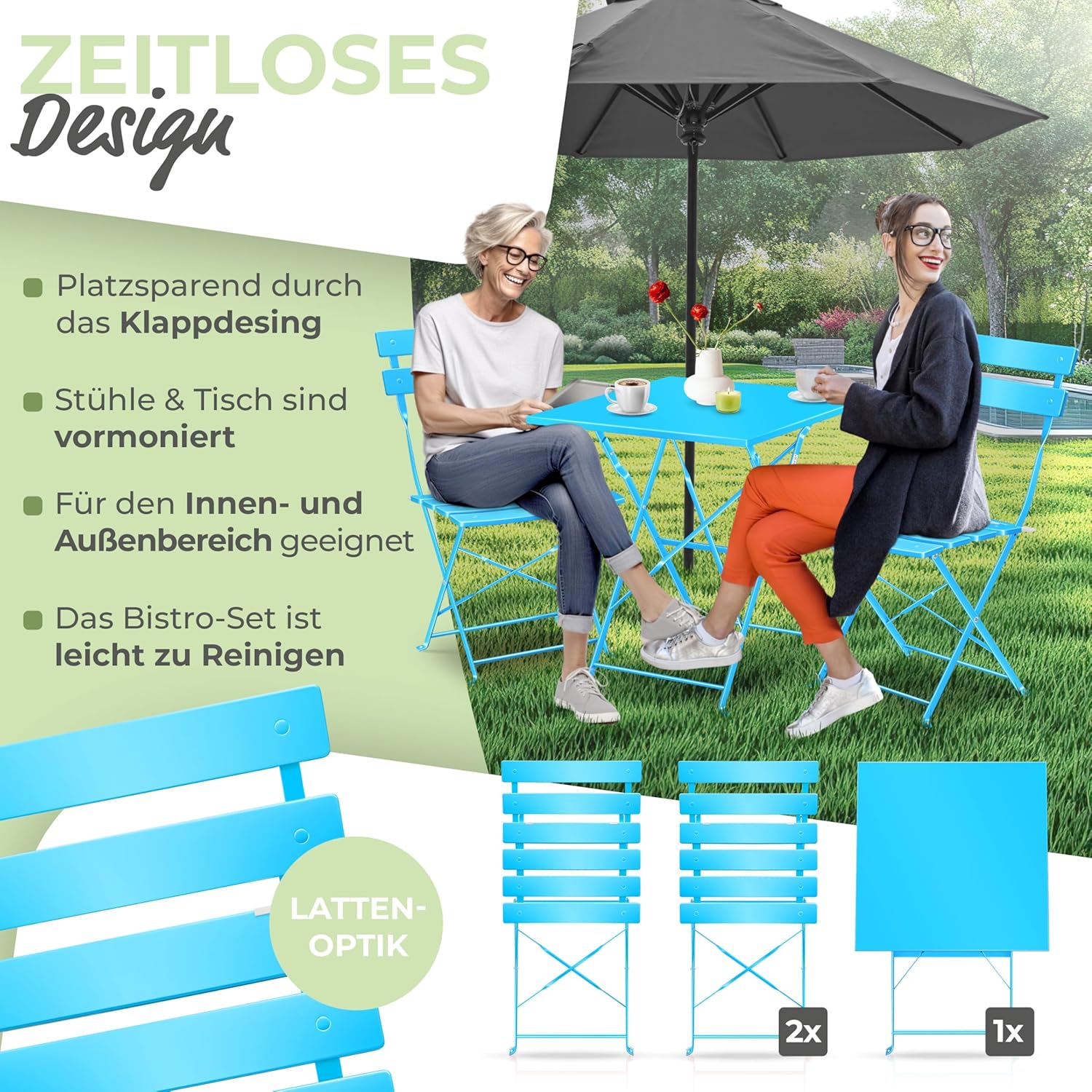 • 3-delige set voor binnen en buiten: de KESSER bistroset bestaat uit een hoekige, inklapbare tafel en twee opvouwbare stoelen – ideaal voor terras, balkon, tuin of binnen. De latten-look zorgt voor een stijlvolle sfeer, terwijl de weerbestendige materialen voor duurzaam gebruiksplezier zorgen. Perfect voor kleine ruimtes dankzij inklapbaar design.