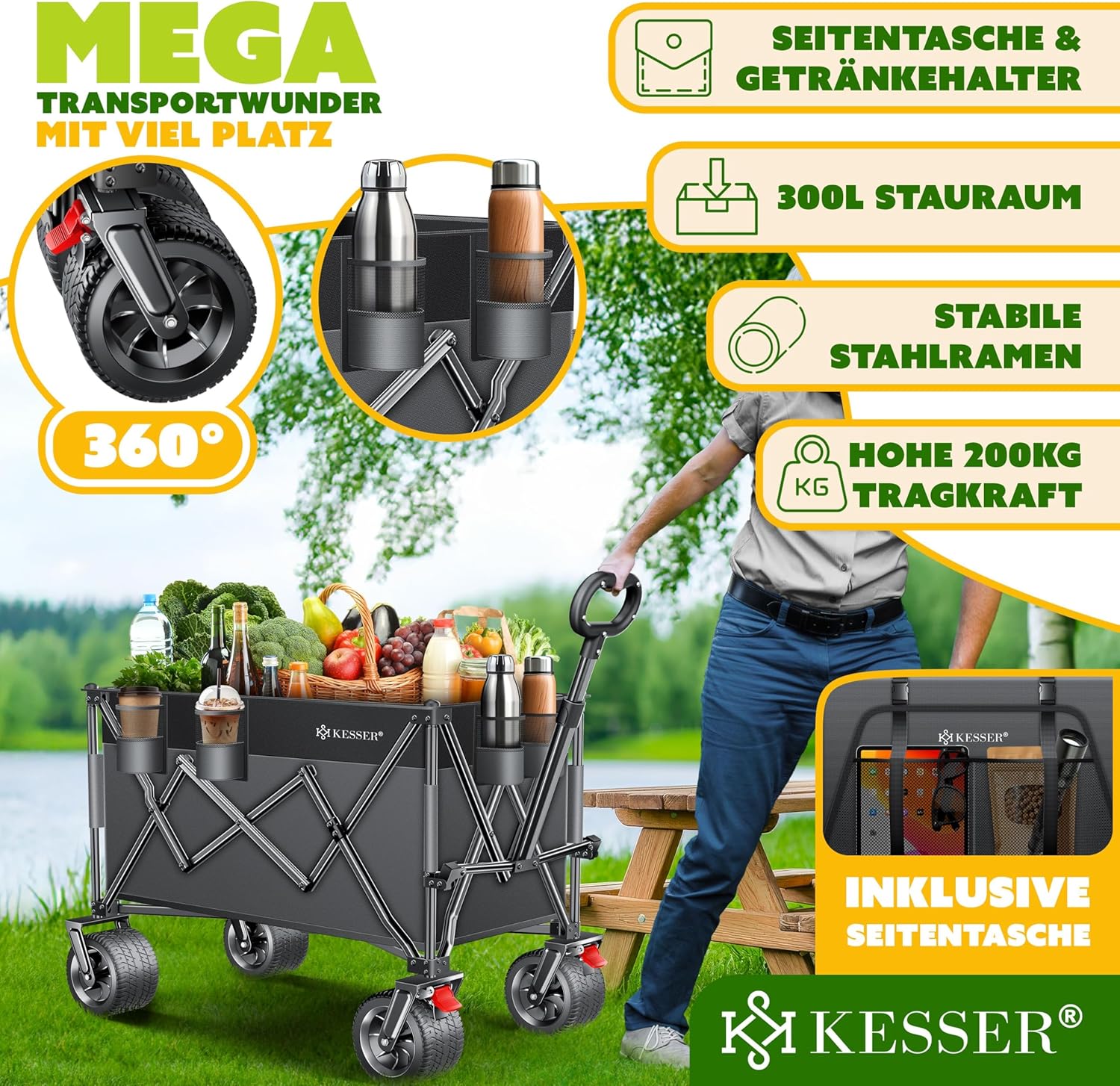 Meer transportwonder: de KESSER Wheely GTR9000 bolderkar biedt een opbergruimte van 300 liter en een draagkracht van 200 kg en is daardoor ideaal voor boodschappen, uitstapjes en tuinieren. Inclusief zijvak en bekerhouder.