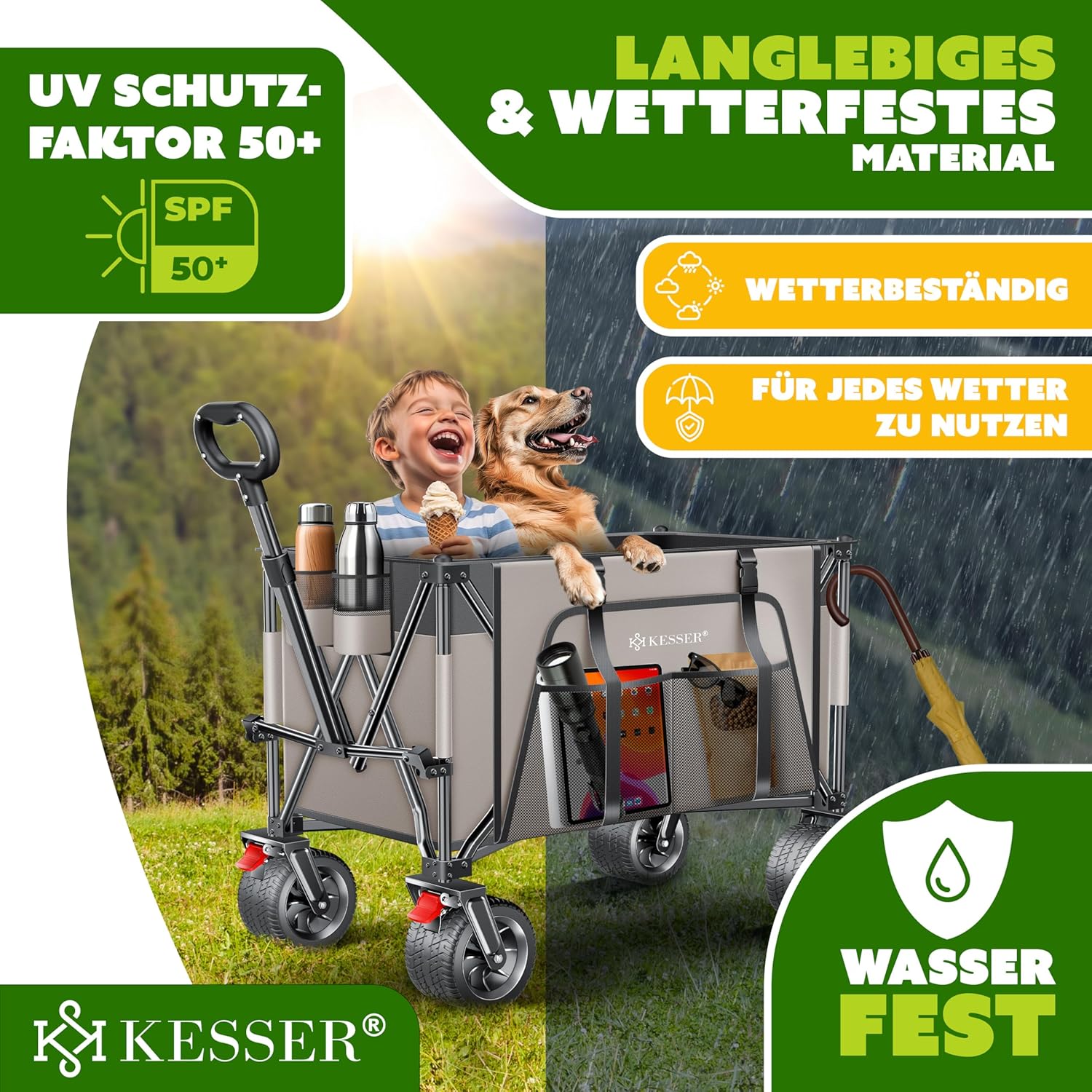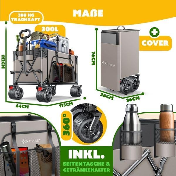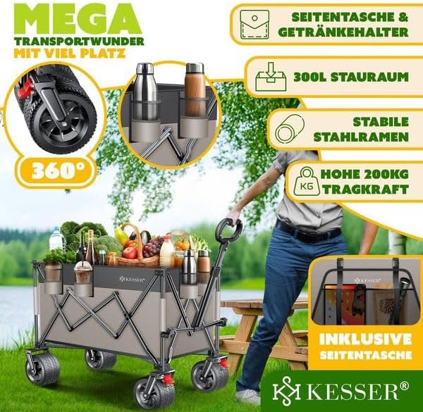 • Meer transportwonder: de KESSER Wheely GTR9000 bolderkar biedt een opbergruimte van 300 liter en een draagkracht van 200 kg en is daardoor ideaal voor boodschappen, uitstapjes en tuinieren. Inclusief zijvak en bekerhouder.
