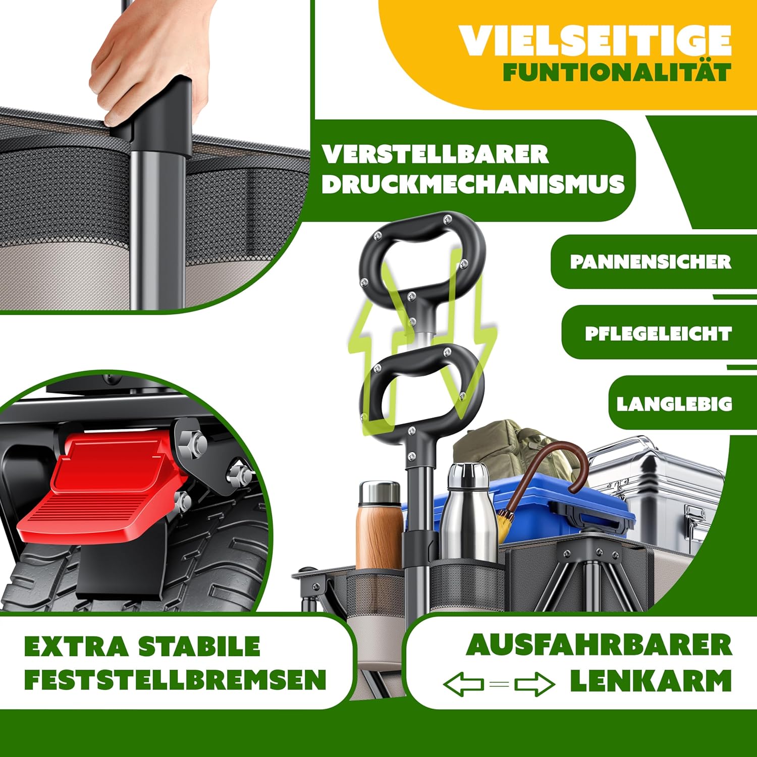• Eenvoudige montage en ruimtebesparend: de bolderkar kan eenvoudig worden gemonteerd en ruimtebesparend worden ingeklapt als hij niet wordt gebruikt. Ideaal voor eenvoudig transport en opslag.