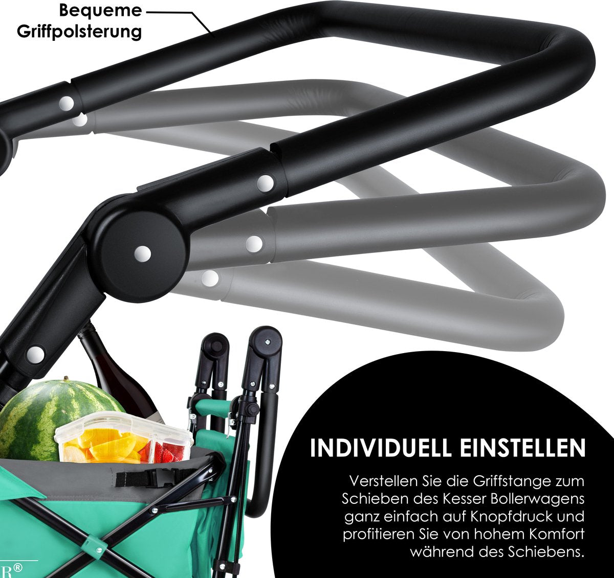 Naast de geïntegreerde XXL tas aan de achterkant en verschillende opbergvakken is de GT-9000 bolderkar uitgerust met twee handvatten om te trekken of te duwen, en 360° draaibare wielen en remmen. De hoogwaardige GT-9000 bolderwagen kan in slechts enkele stappen snel worden gemonteerd en opgevouwen en opgeborgen in de meegeleverde draagtas (bij levering inbegrepen).