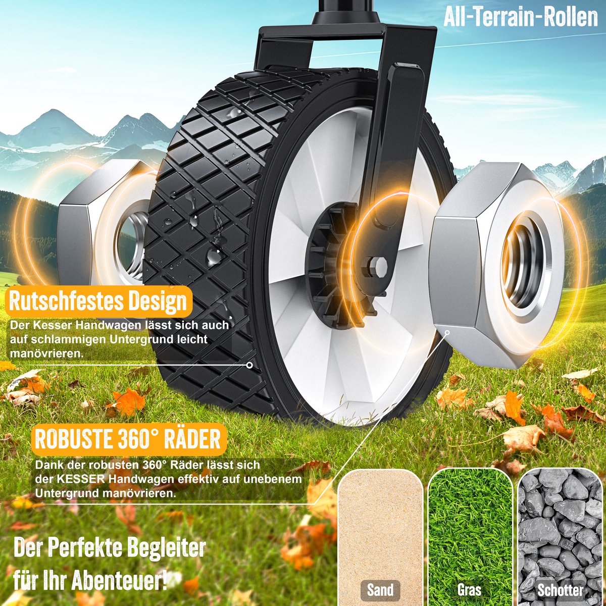 De opvouwbare bolderkar van KESSER, met stabiliteit en duurzaamheid, zorgt voor een maximaal draagvermogen tot 100 kg, een gevoerde en ergonomische handgreep, en 360° draaibare voorwielen van volrubber.