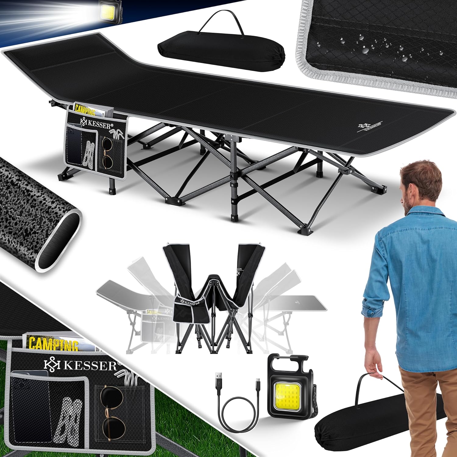 KESSER Premium campingbed voor een aangename slaap, snelle montage en demontage dankzij vouwsysteem, maximale belastbaarheid tot 250 kg, inclusief draagtas voor flexibel transport, robuuste en stabiele metalen constructie incl. antislipvoetjes.
