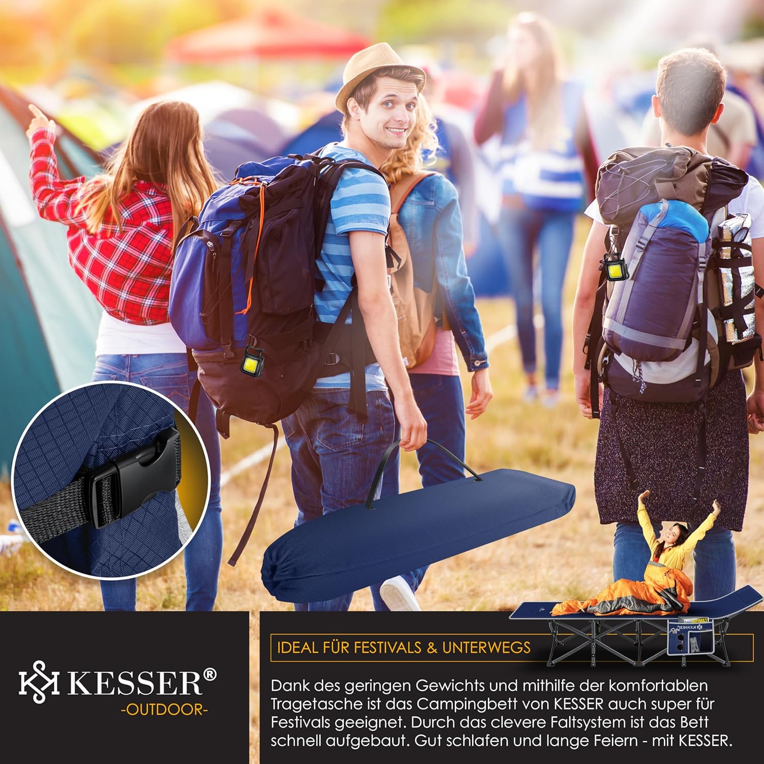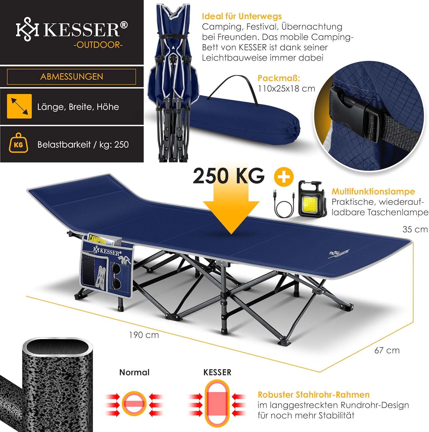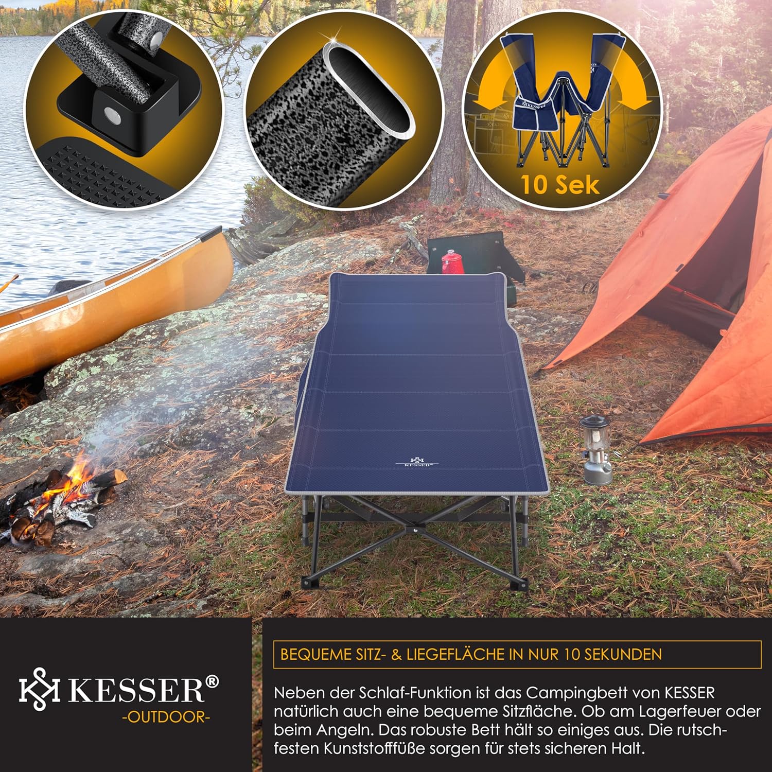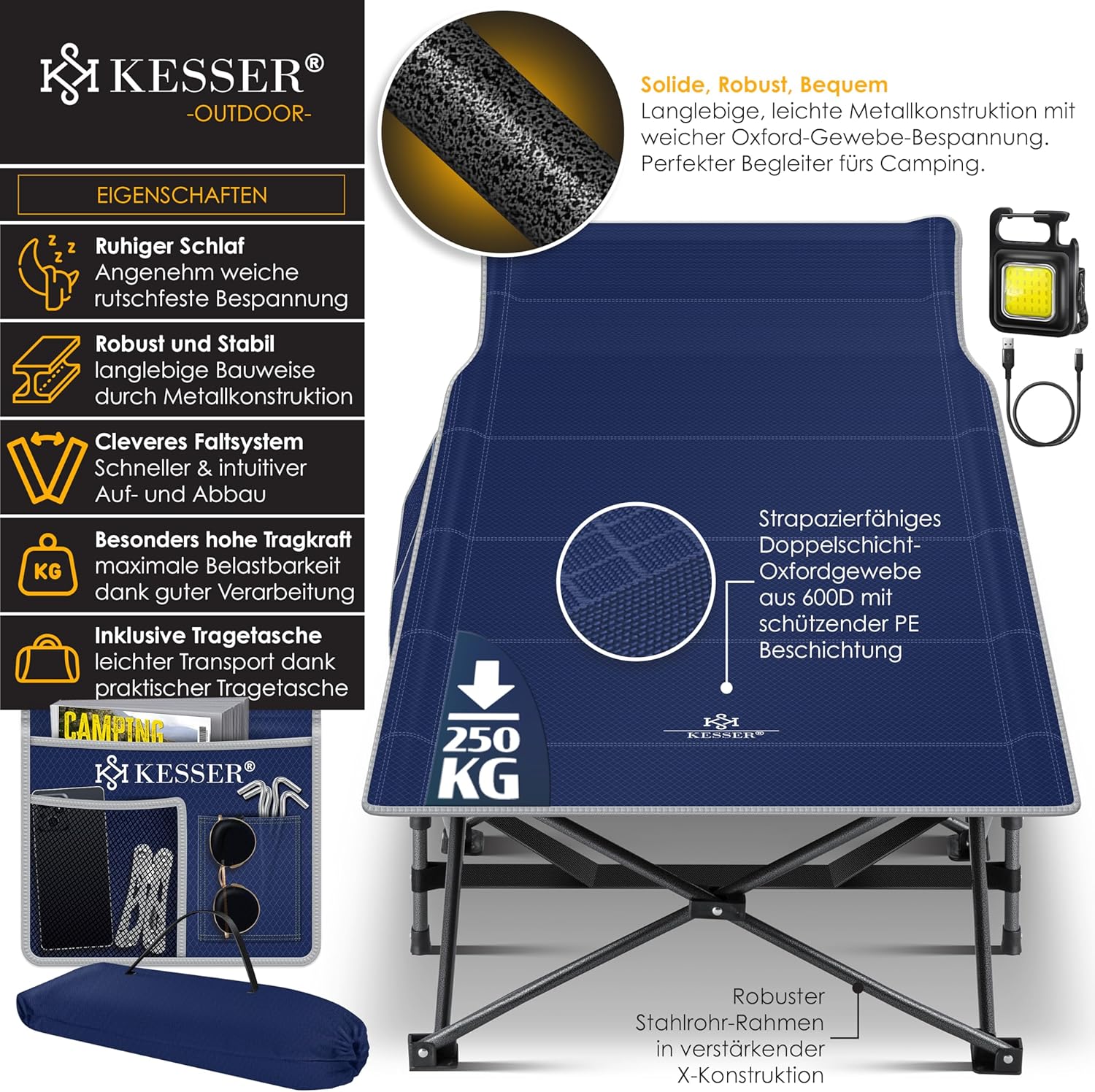 KESSER Premium campingbed voor een aangename slaap, snelle montage en demontage dankzij vouwsysteem, maximale belastbaarheid tot 250 kg, inclusief draagtas voor flexibel transport, robuuste en stabiele metalen constructie incl. antislipvoetjes.