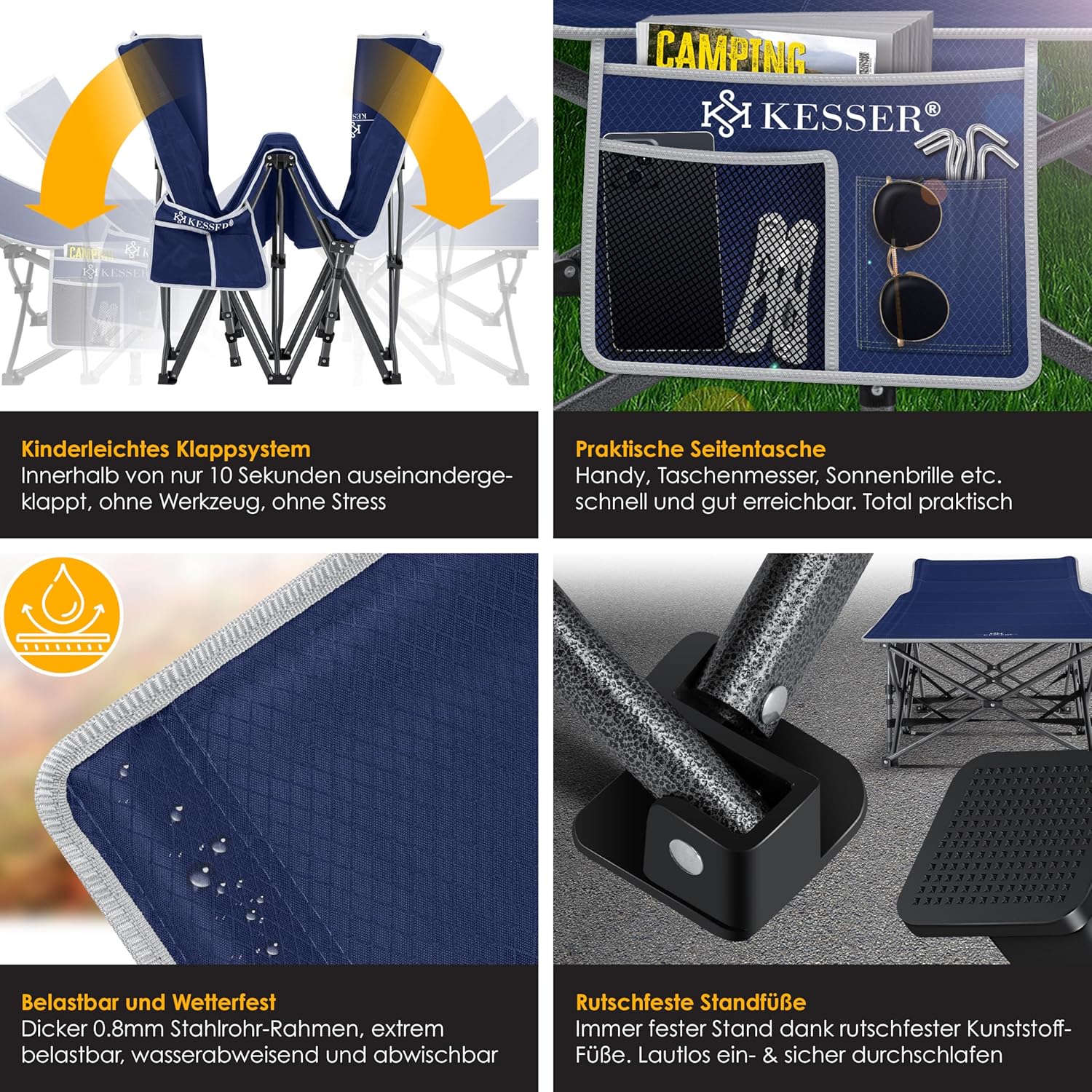 - Hoogwaardig veldbed: het KESSER campingbed Premium is een hoogwaardig veldbed, dat speciaal is ontwikkeld voor gebruik buitenshuis. Met een aangenaam zachte en antislip bekleding van Oxford-stof is het bijzonder comfortabel en eenvoudig te onderhouden. Het waterafstotende oppervlak maakt het mogelijk om het bed snel en eenvoudig af te vegen en te reinigen, zo blijf je ook na een korte regenbui droog.