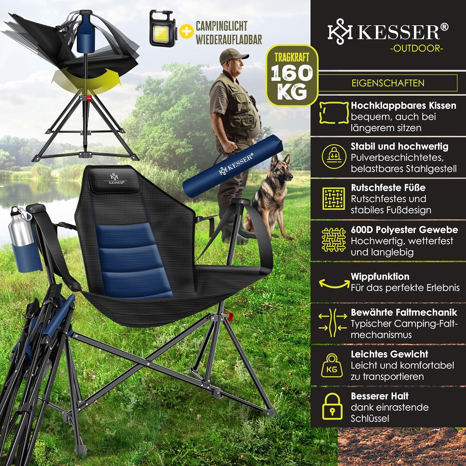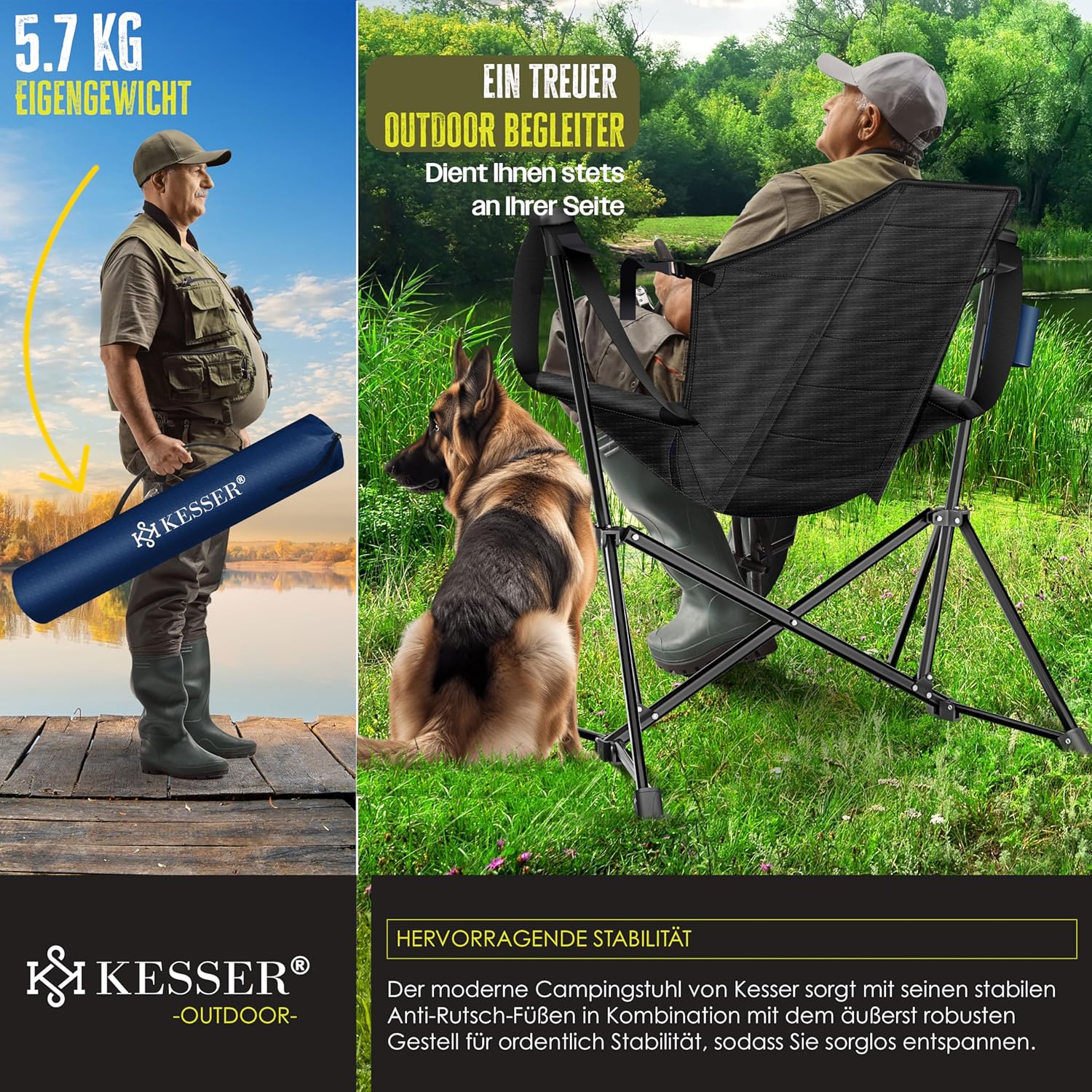 Gemakkelijk te vervoeren en mee te nemen: ondanks zijn robuustheid en stabiliteit is de KESSER campingstoel licht en comfortabel te vervoeren. Met een gewicht van slechts 5,7 kg en een meegeleverde transporttas kun je deze campingstoel moeiteloos meenemen naar campinguitstapjes, picknicks of festivals.