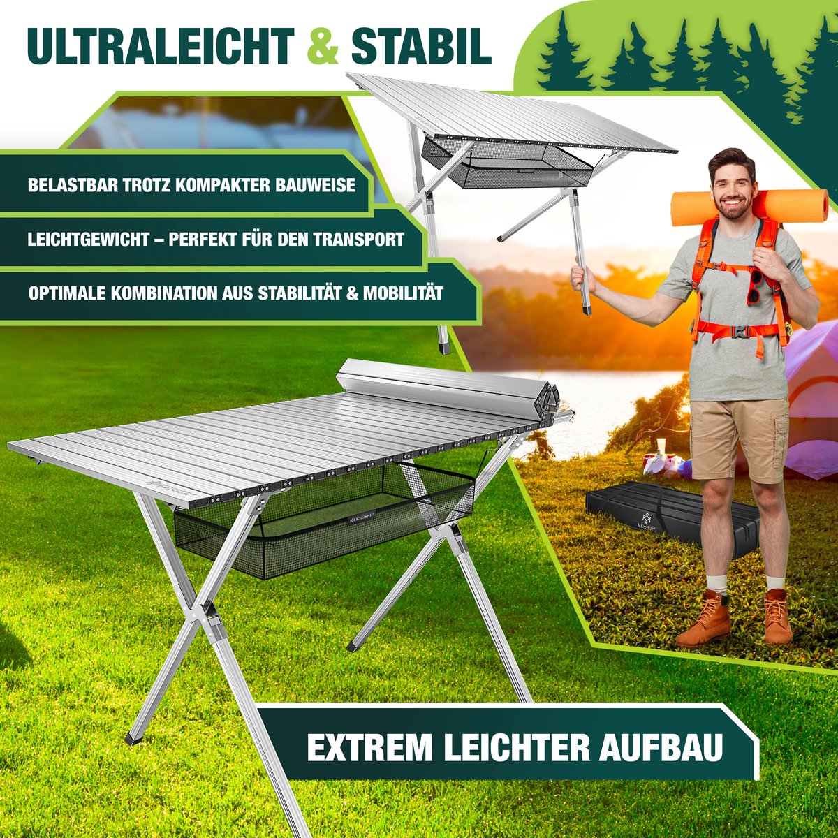 MULTIFUNCTIONEEL MET EXTRA OPBERGRUIMTE: De tafel is ideaal voor koken, eten, werken of spelen in de buitenlucht. Het extra in te spannen net onder het tafelblad biedt praktische opbergruimte voor keukengerei, spelletjes of andere spullen. Maximale flexibiliteit voor elk outdoor-avontuur – functioneel, mobiel en betrouwbaar!