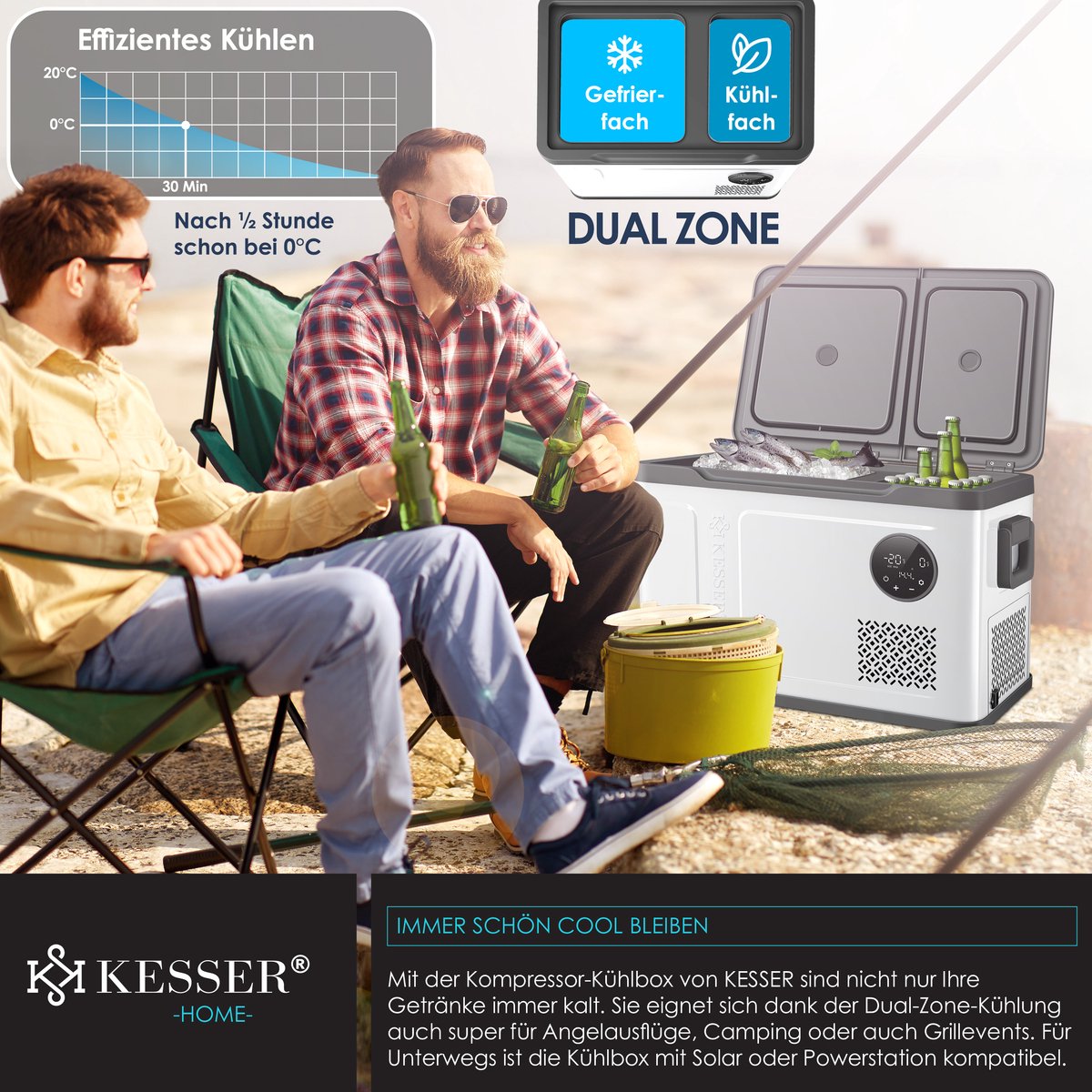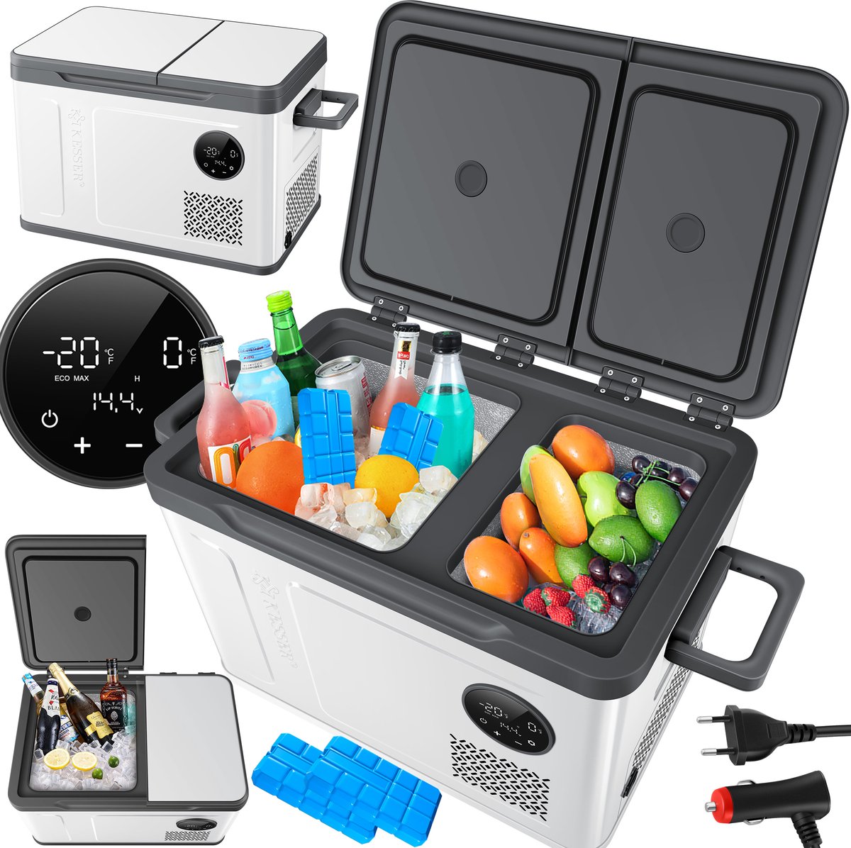 KESSER compressorkoeler met DUAL-ZONE koeling, schokbestendig ontwerp en LED-display, 2 koelmodi / Max + Eco, 3-traps batterijbeveiliging, stille werking door 45dB, verkrijgbaar in drie verschillende maten.