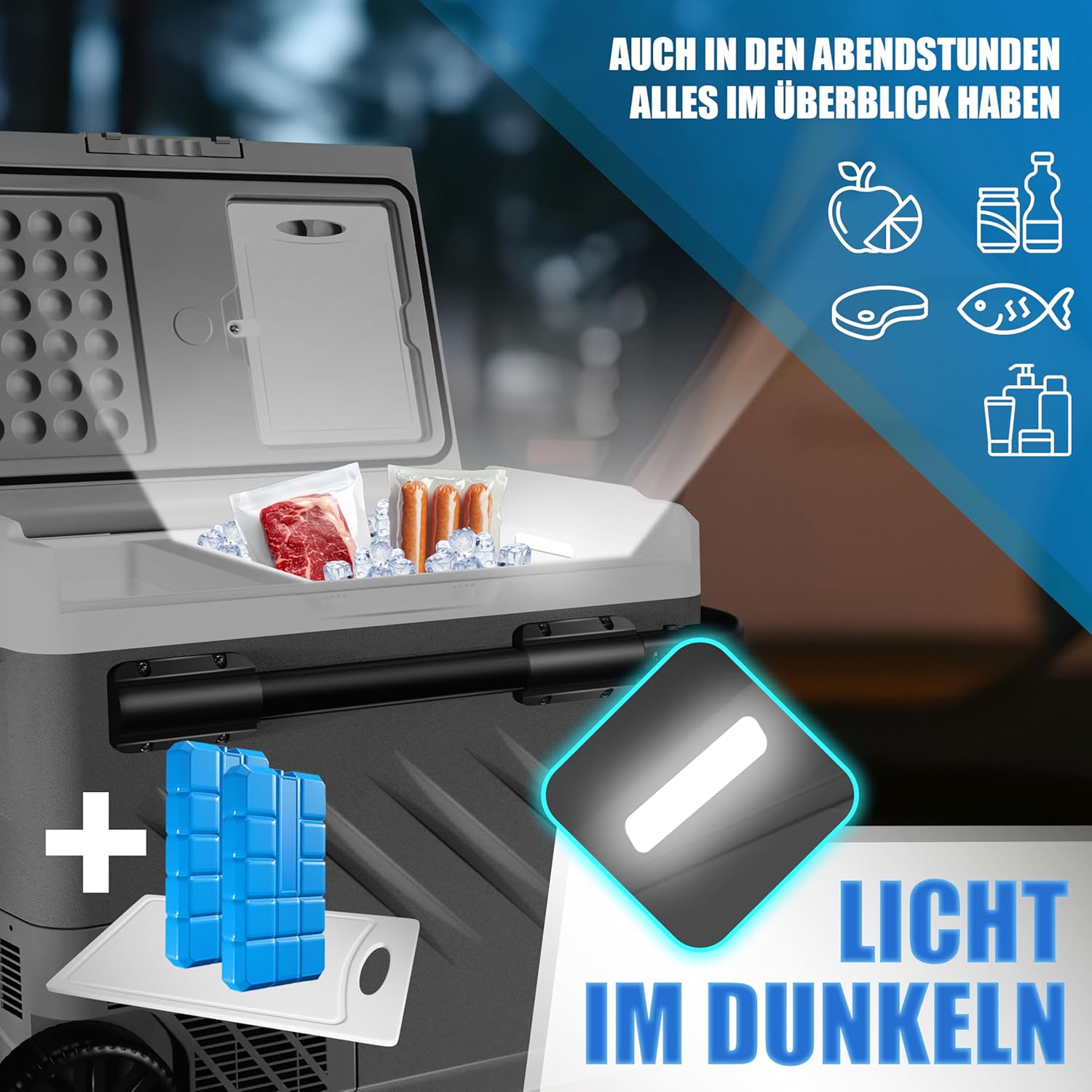 • Veelzijdig inzetbaar: de compressorkoelbox bereikt binnen slechts 30 minuten een temperatuur van 0 °C en is daardoor de perfecte oplossing voor visuitstapjes, campinguitstapjes, outdoor-evenementen, maar ook voor gebruik in woon- en privéruimtes of op boten. De koelbox is zelfs compatibel met zonne- of powerstations, wat hem tot een milieuvriendelijke en onafhankelijke oplossing voor onderweg maakt.