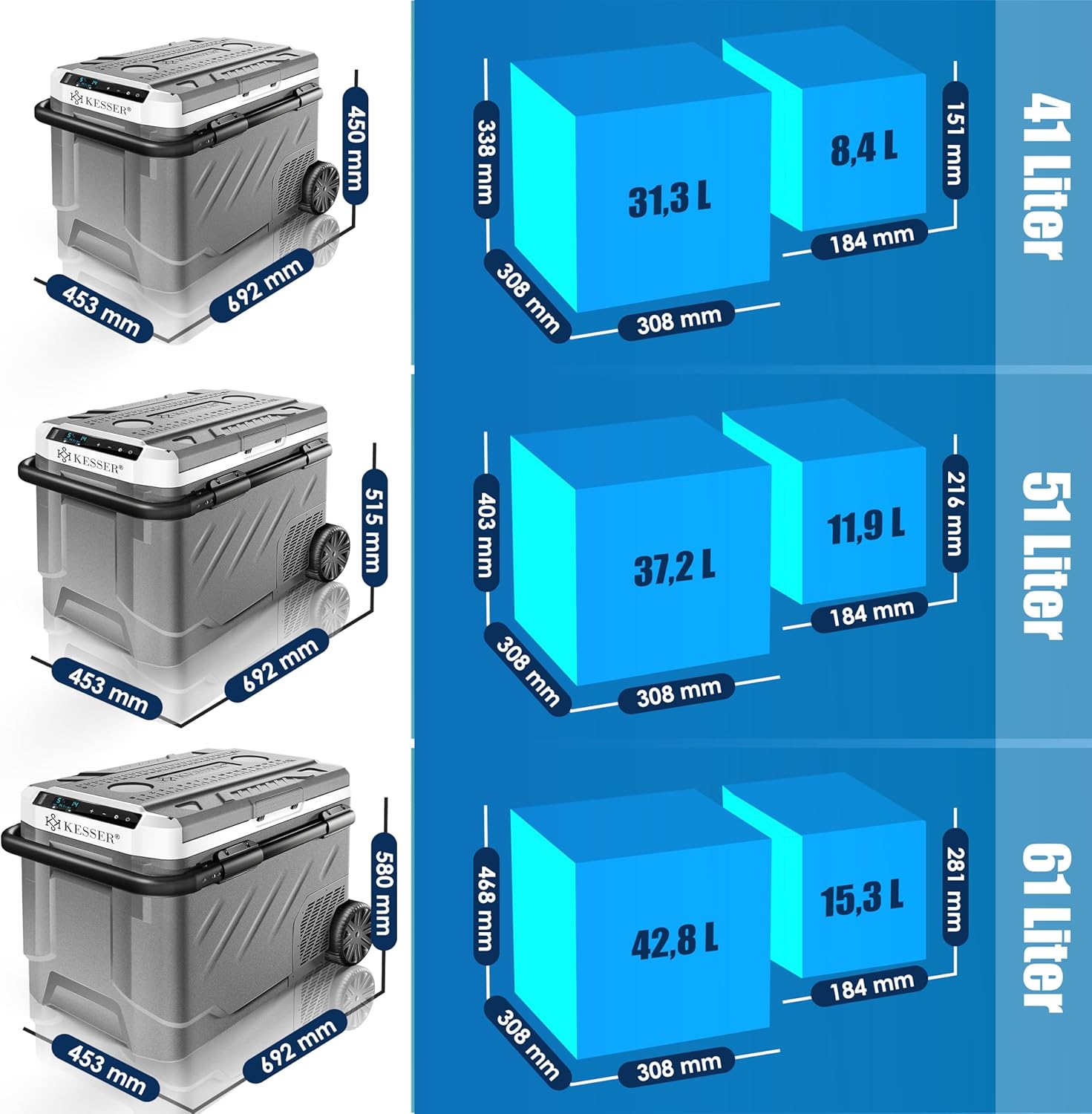 • Veilig en koelvak: de compressorkoelbox is een hoogwaardig en veelzijdig apparaat dat speciaal is ontwikkeld om levensmiddelen en dranken onderweg vers te houden. Dankzij de Dual Zone koeling kun je verschillende soorten levensmiddelen apart van elkaar koelen of invriezen. Het vriesvak biedt indrukwekkende prestaties met een temperatuur van maximaal -20 °C, terwijl het koelvak een temperatuur van 17 °C tot 0 °C kan bereiken.