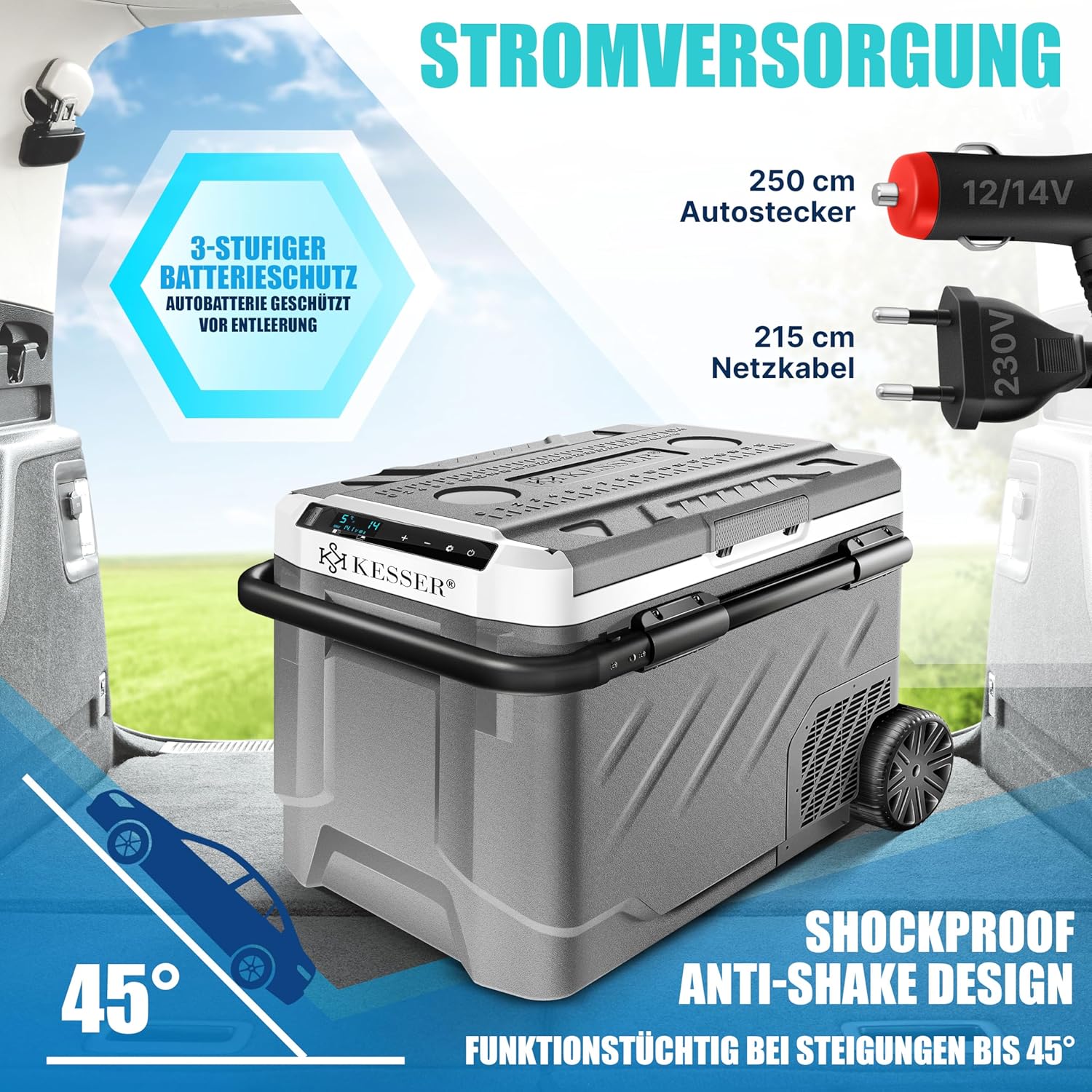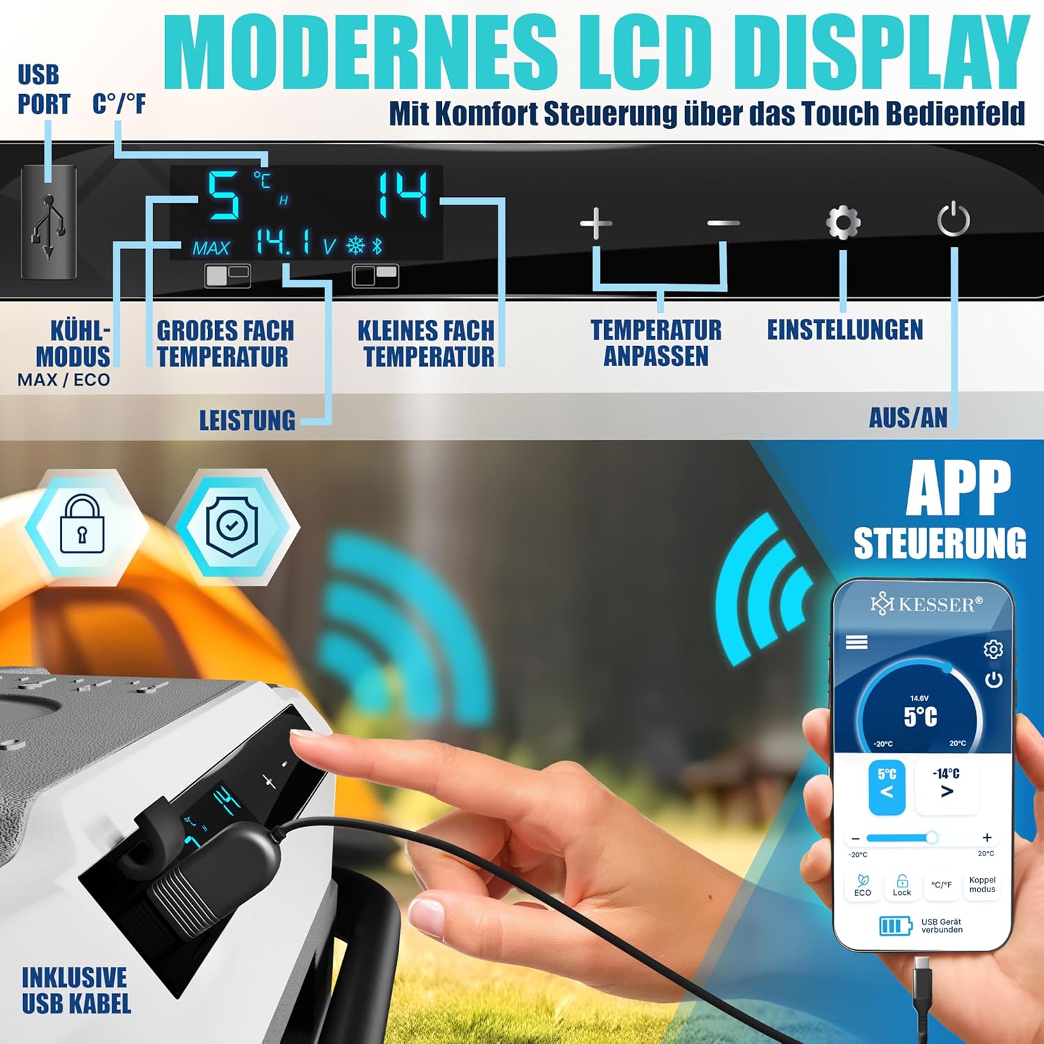 • Compact design en app-bediening: de bediening van de koelbox van het merk KESSER is gebruiksvriendelijk, dankzij het led-display en het touch-display. Met een paar druk op de knop kun je de temperatuur en andere instellingen aanpassen en zo de perfecte omgeving voor je levensmiddelen creëren. Het schokbestendige ontwerp zorgt ervoor dat de koelbox bij een helling van 45° stabiel en betrouwbaar blijft. Daarnaast kan de koelbox via de app worden bediend.