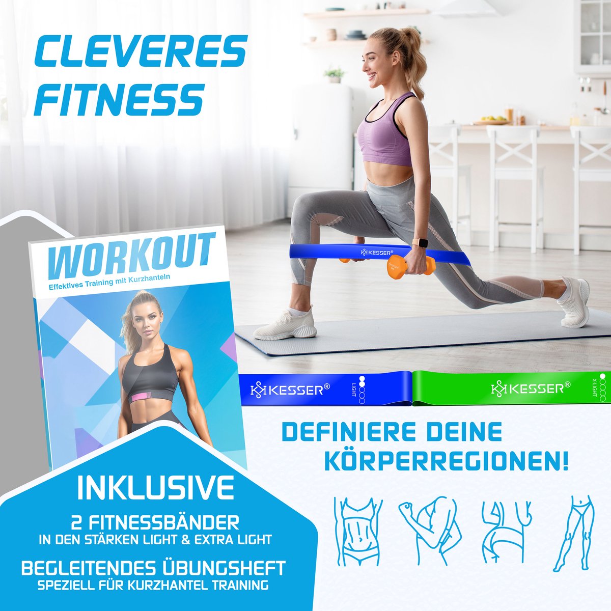 Voor nog meer variatie in je training zijn er twee fitnessbanden inbegrepen in het set – in de sterkte “Light” en “Extra Light”. Deze banden zijn perfect voor rek- en mobiliteitsoefeningen of als extra weerstand bij je haltertraining. Je kunt je kracht en flexibiliteit op verschillende manieren verbeteren door de banden in je workout te integreren.