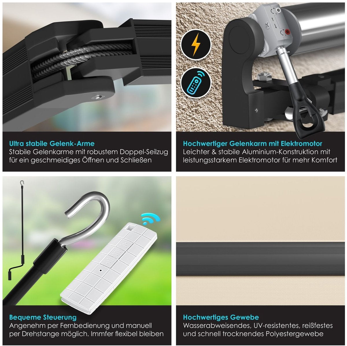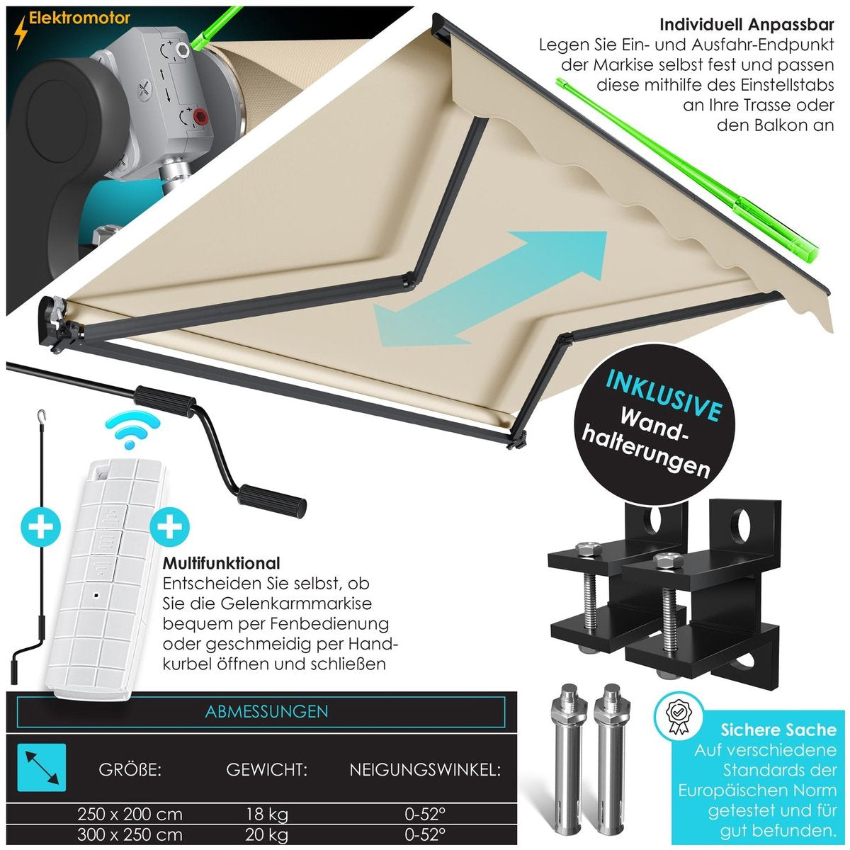 De parasol wordt geleverd met een stevige muurbeugel en montageset , voor een snelle en eenvoudige installatie. Als alternatief kan de parasol ook handmatig worden bediend met een handslinger . De individueel instelbare begin- en eindpunten van de parasol zorgen voor een perfecte pasvorm op elk balkon of terras. Zo kan de parasol optimaal worden gebruikt om buiten te zitten, zelfs bij slecht weer of felle zon.
