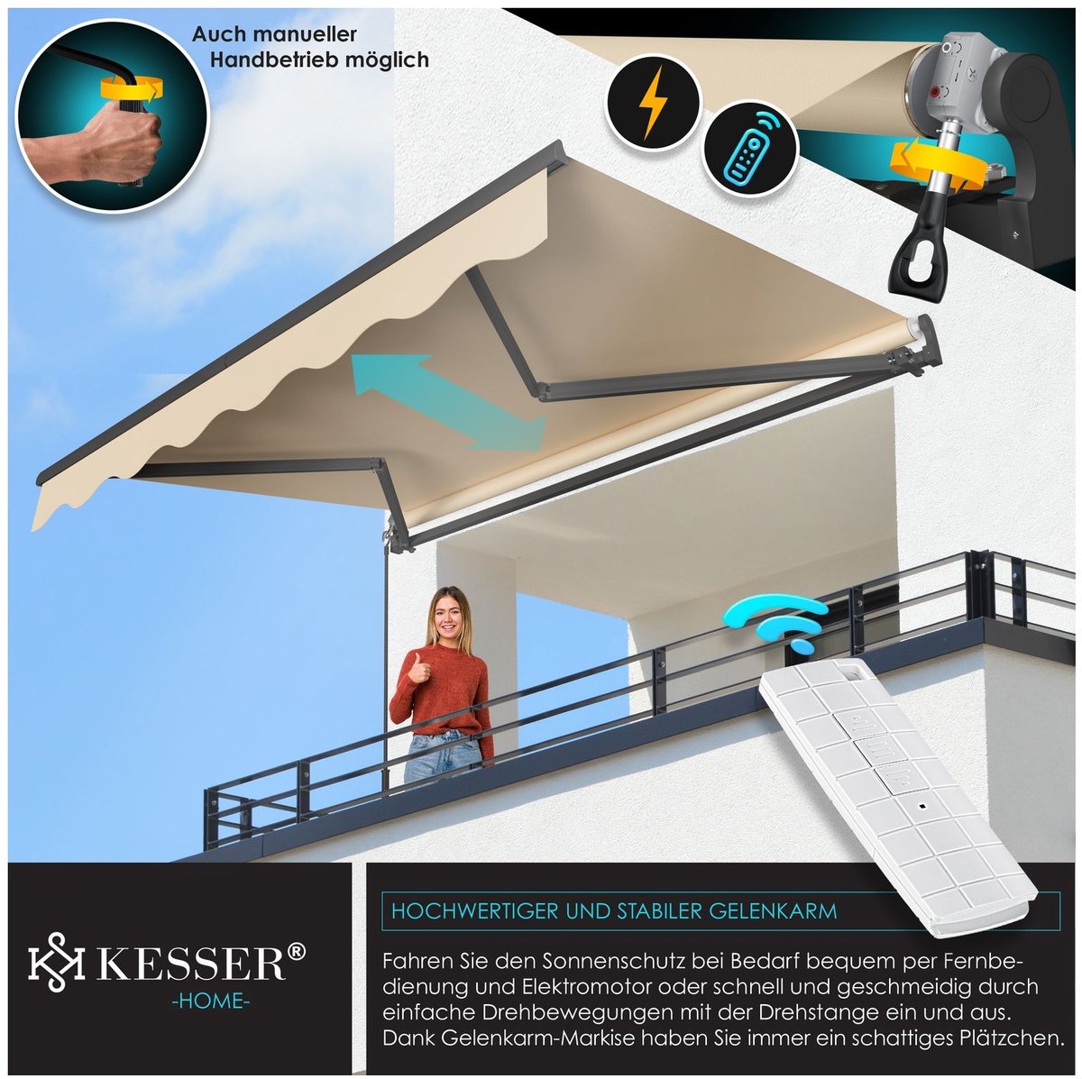 Onze balkonzonwering van KESSER is eenvoudig in- en uit te schuiven met een afstandsbediening en een elektromotor . De bediening is bijzonder eenvoudig en intuïtief, voor een snelle en comfortabele bediening. Zo geniet u op elk moment van de gewenste zonwering, zonder dat u deze handmatig hoeft in- of uit te schuiven.