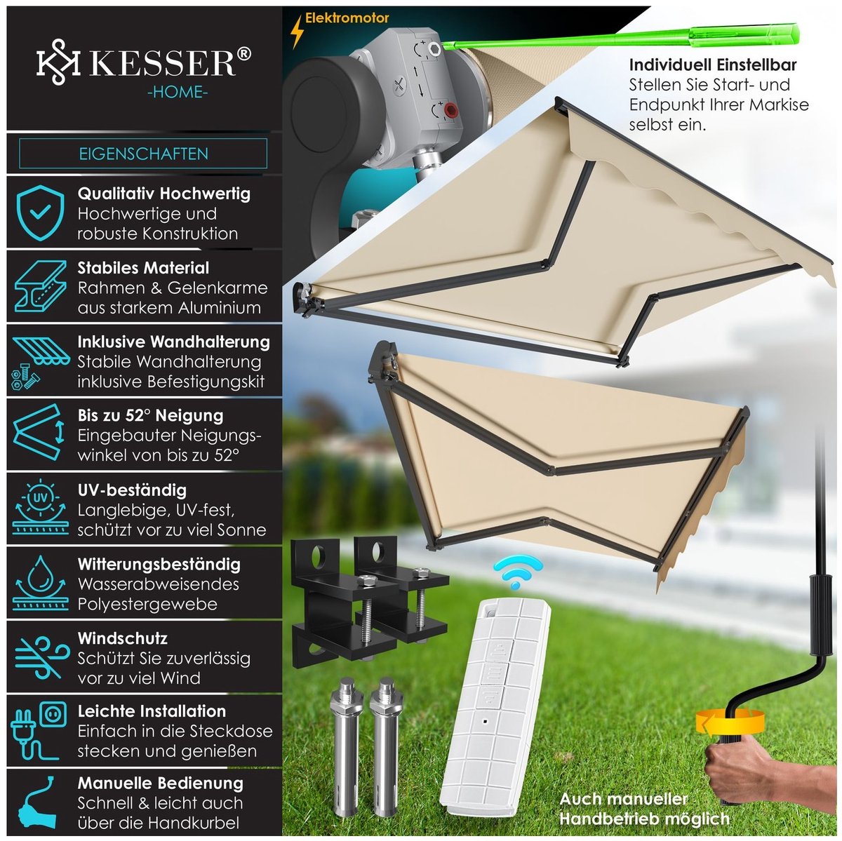 KESSER knikarmscherm, elektrisch en met slinger te bedienen, eind- en beginpunt verstelbaar, hellingshoek tot 52° instelbaar, uv-bestendig en waterafstotend, inclusief muurconsole en slinger