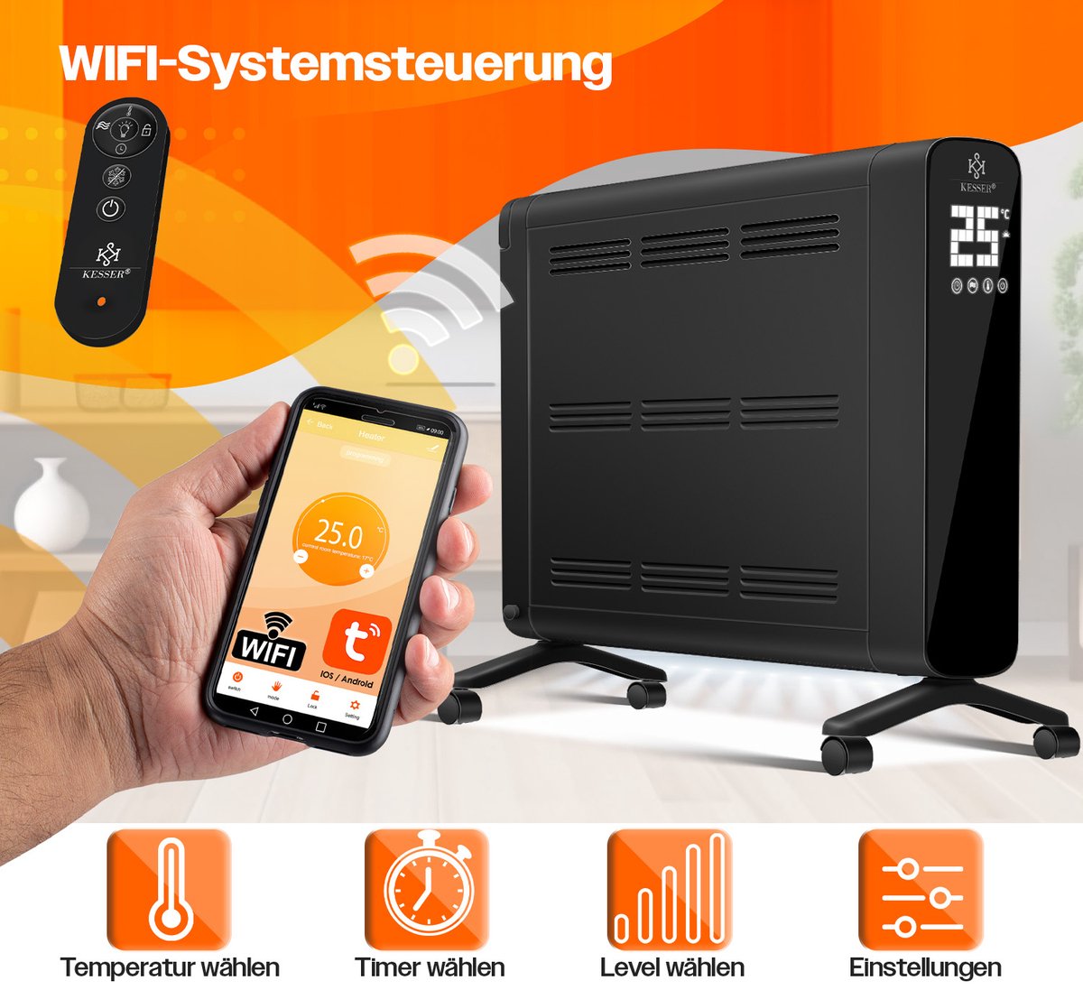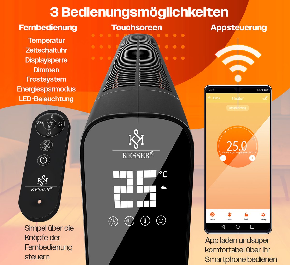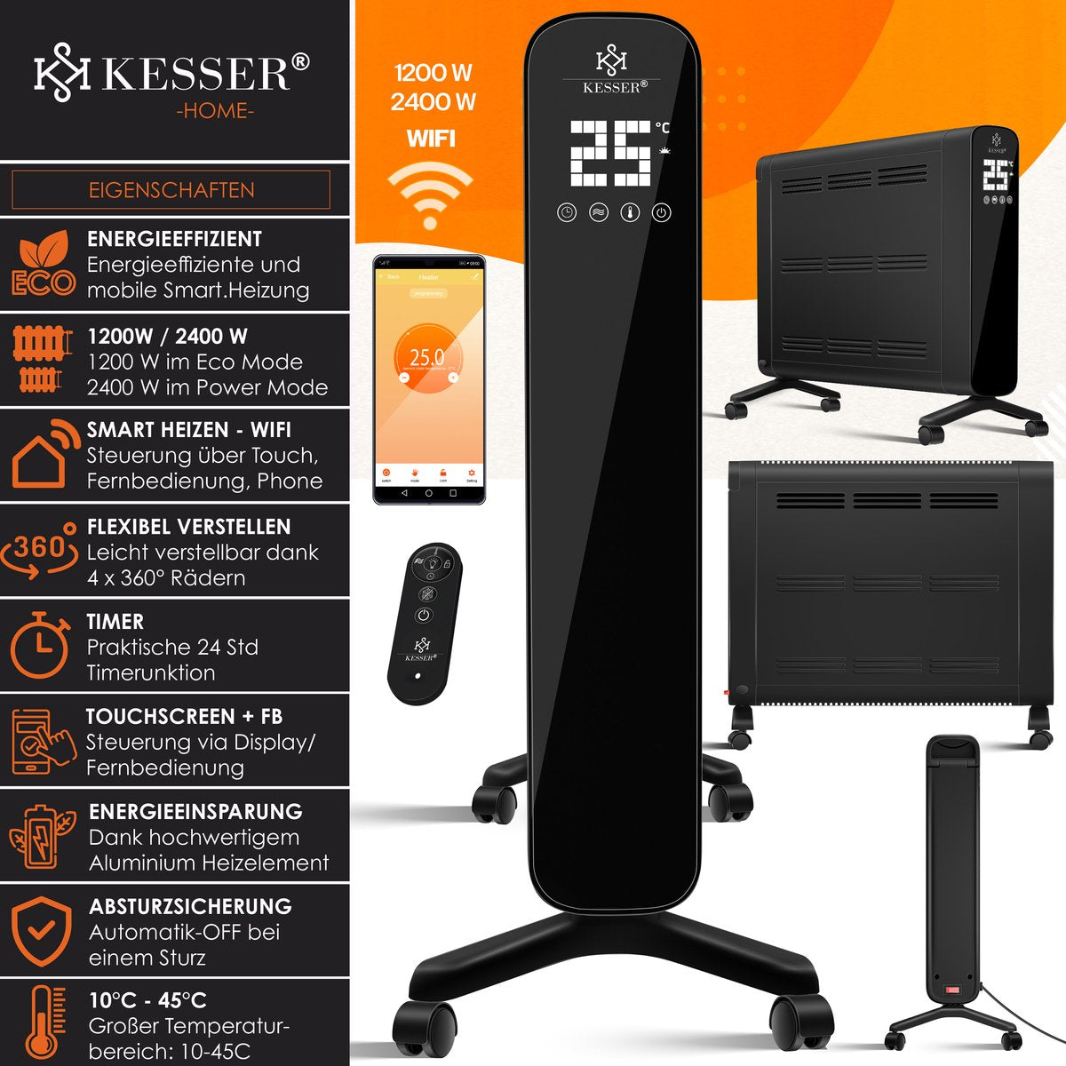 KESSER Convector Kachel Vermogen van 1200W in Ecomode en 2400W in Power Mode, gecombineerd met Smart Heating WiFi-functie voor flexibele bediening via touch display, afstandsbediening of smartphone app, mobiliteit dankzij 360° wielen, praktische 24-uurs timerfunctie