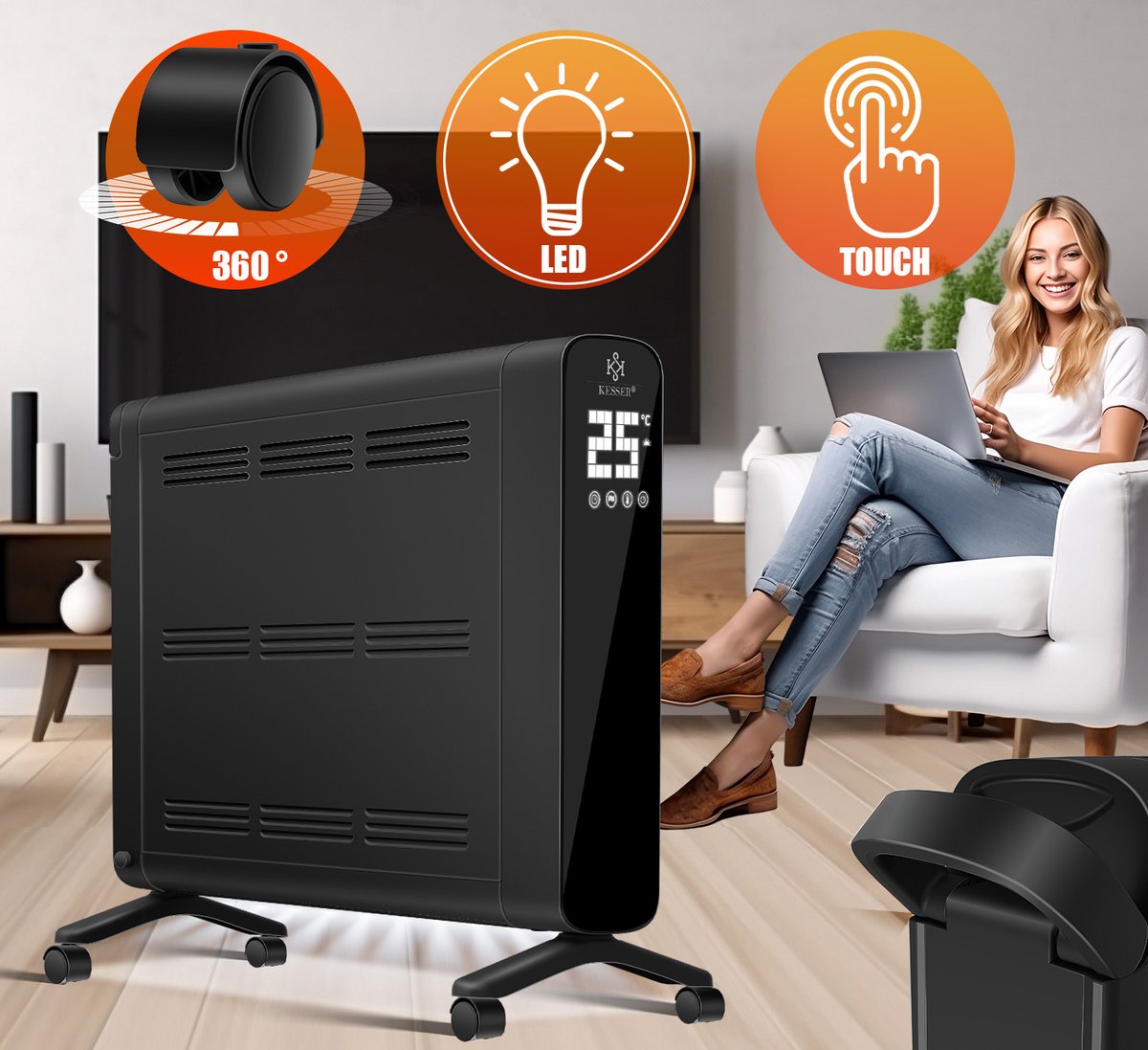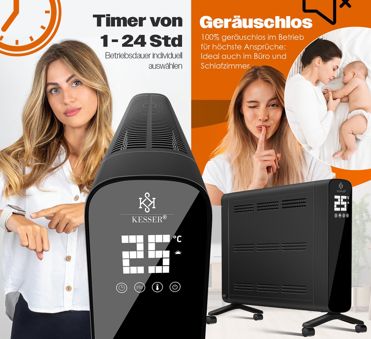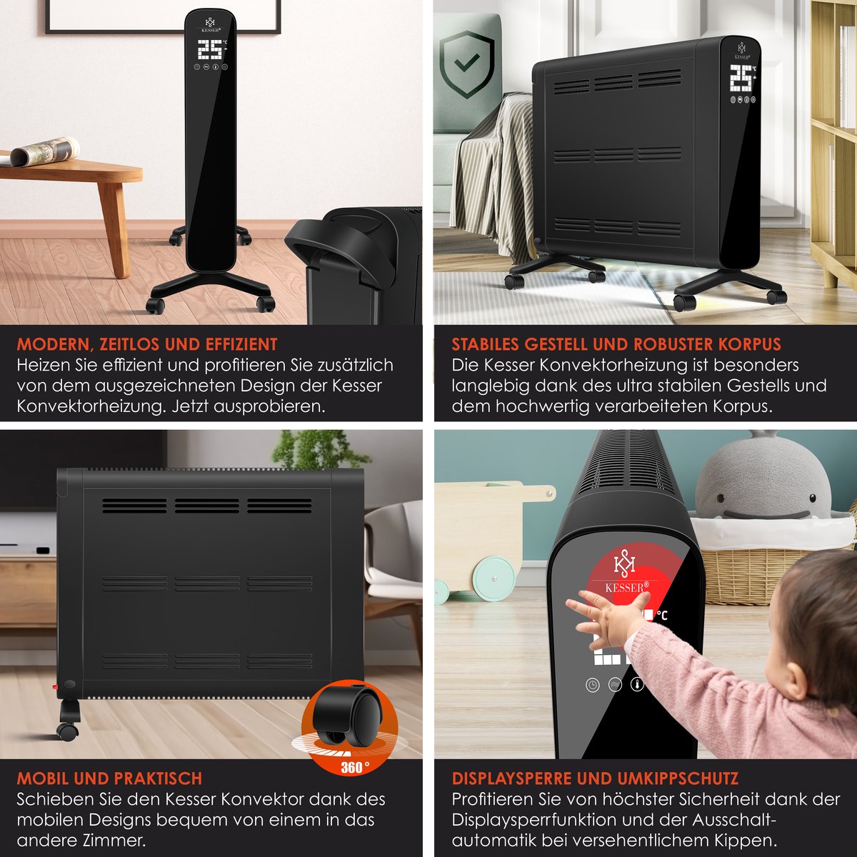 KESSER Convector Kachel Vermogen van 1200W in Ecomode en 2400W in Power Mode, gecombineerd met Smart Heating WiFi-functie voor flexibele bediening via touch display, afstandsbediening of smartphone app, mobiliteit dankzij 360° wielen, praktische 24-uurs timerfunctie