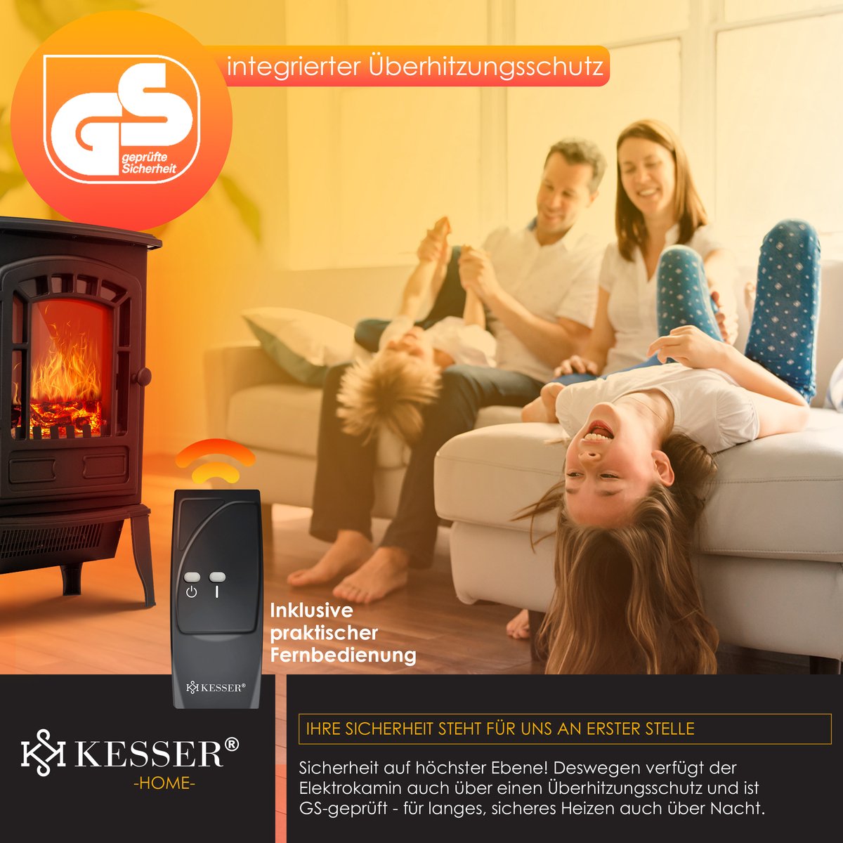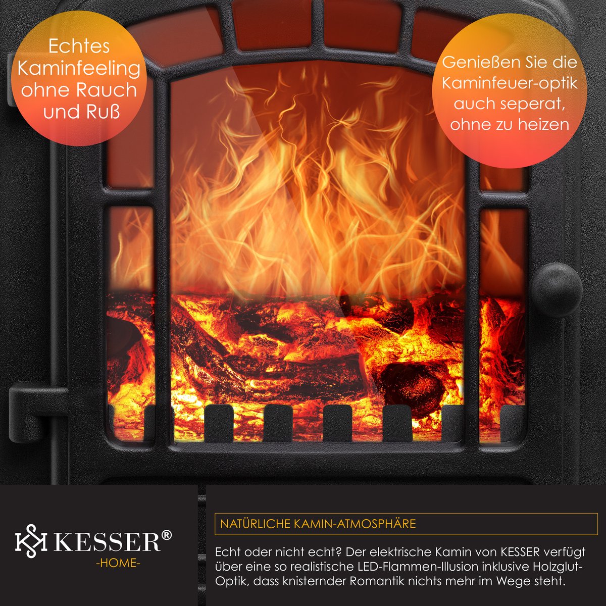 De KESSER elektrische haard met geïntegreerde ventilatorkachel zorgt voor een romantische sfeer dankzij een bedrieglijk echt vuureffect, bijzonder krachtig en toch stil dankzij 2000W.