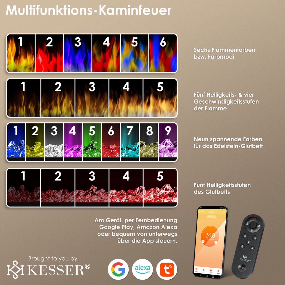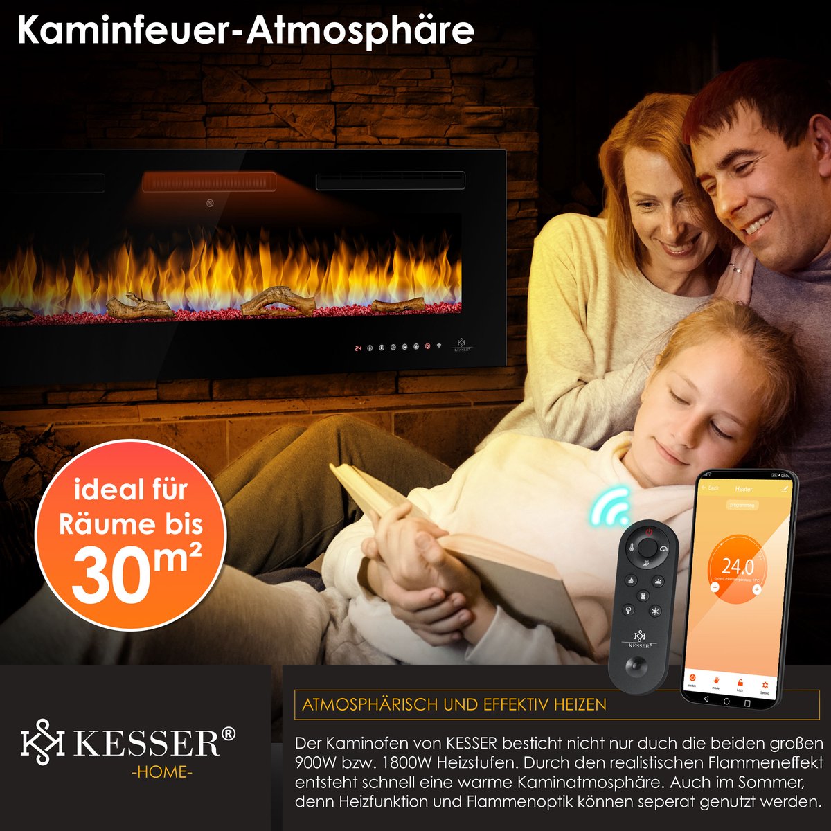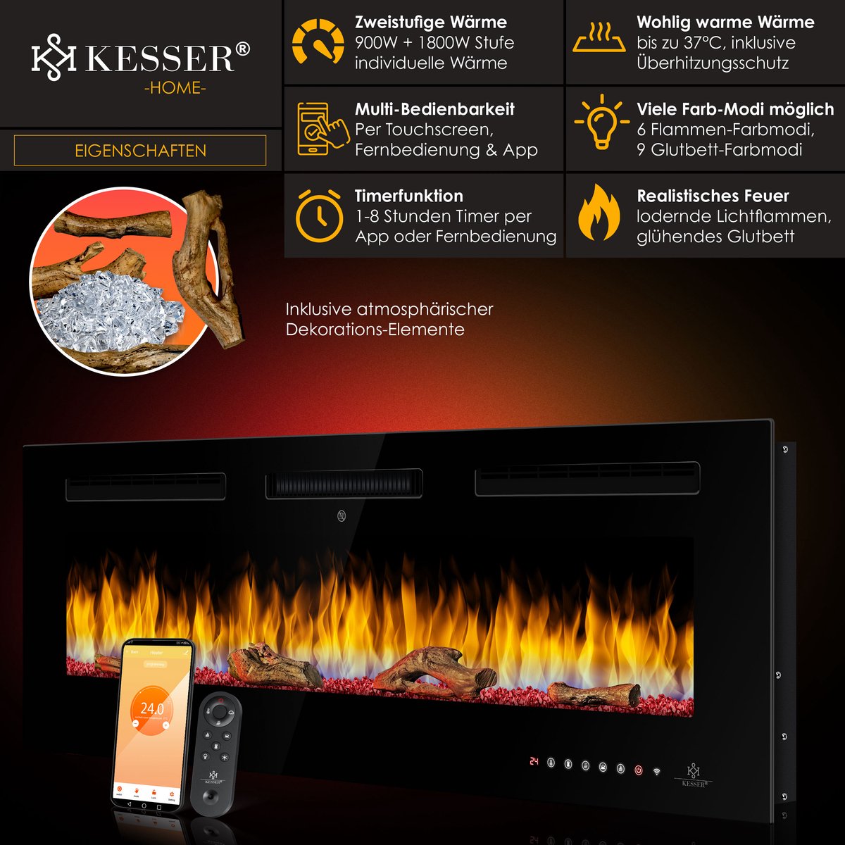 KESSER kachel met tweetraps warmte (900W & 1800W) tot 37°C, realistische vlammen, incl. afstandsbediening, touchscreen en WiFi-appfunctie, geïntegreerde timerfunctie, echt vlameffect met 9 vlammen, 5 helderheidsinstellingen, oververhittingsbeveiliging en anti-kantelbeveiliging, eenvoudig te installeren in of aan de muur.