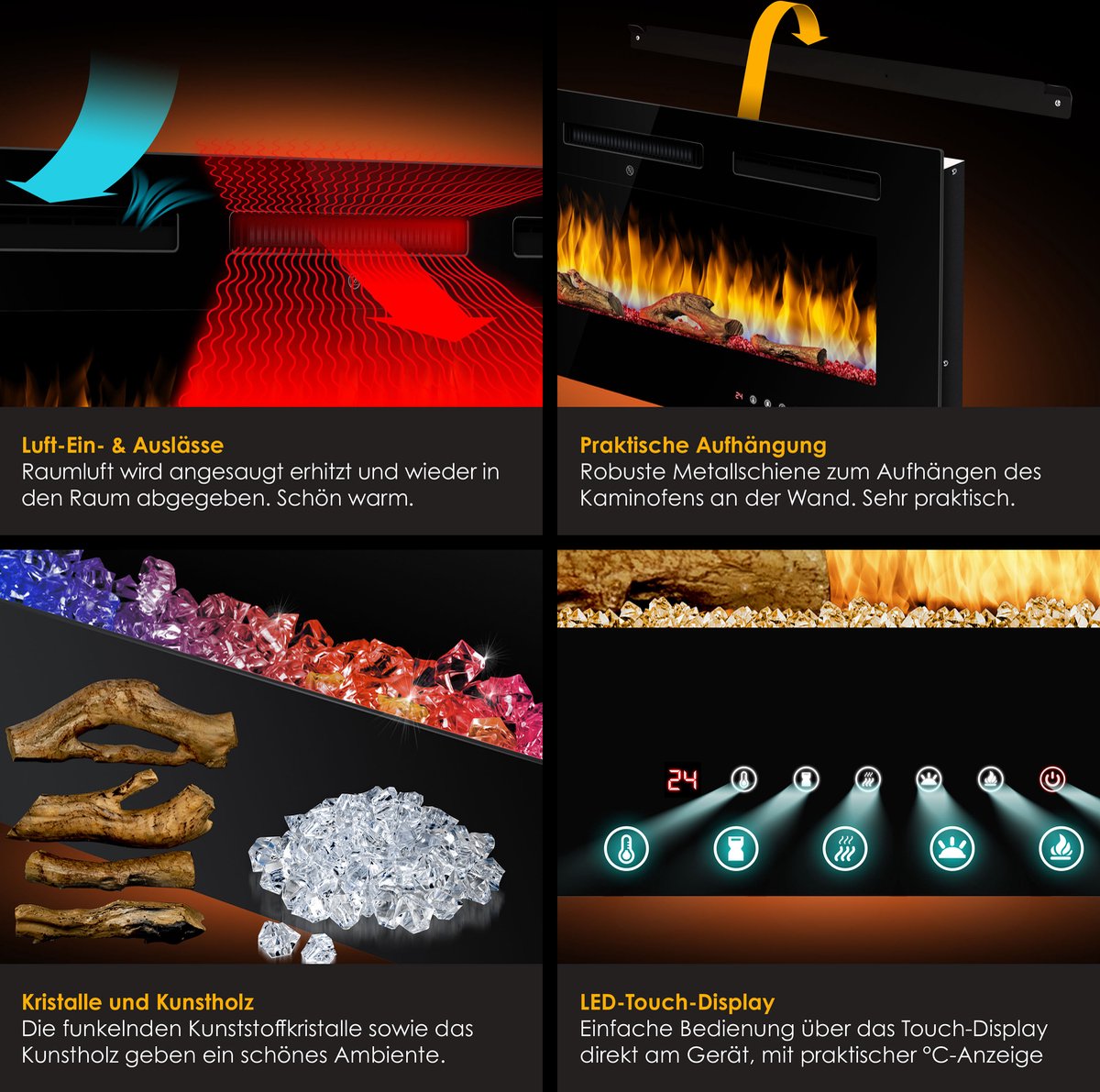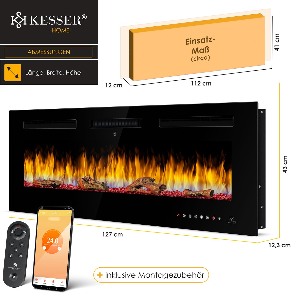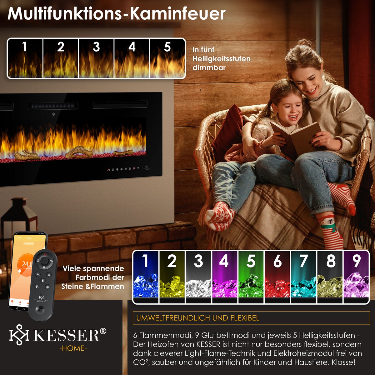 KESSER kachel met tweetraps warmte (900W & 1800W) tot 37°C, realistische vlammen, incl. afstandsbediening, touchscreen en WiFi-appfunctie, geïntegreerde timerfunctie, echt vlameffect met 9 vlammen, 5 helderheidsinstellingen, oververhittingsbeveiliging en anti-kantelbeveiliging, eenvoudig te installeren in of aan de muur.