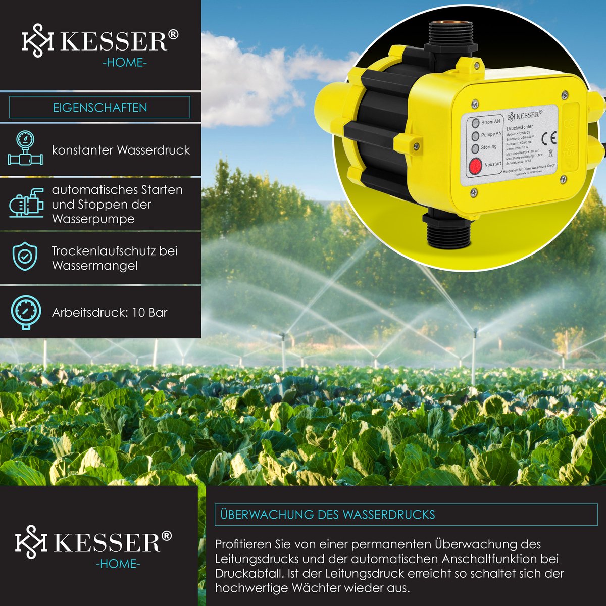 KESSER pompbesturing bewaakt de waterdruk dankzij automatisch in- en uitschakelen en constante waterdruk, elimineert het effect van drukpieken