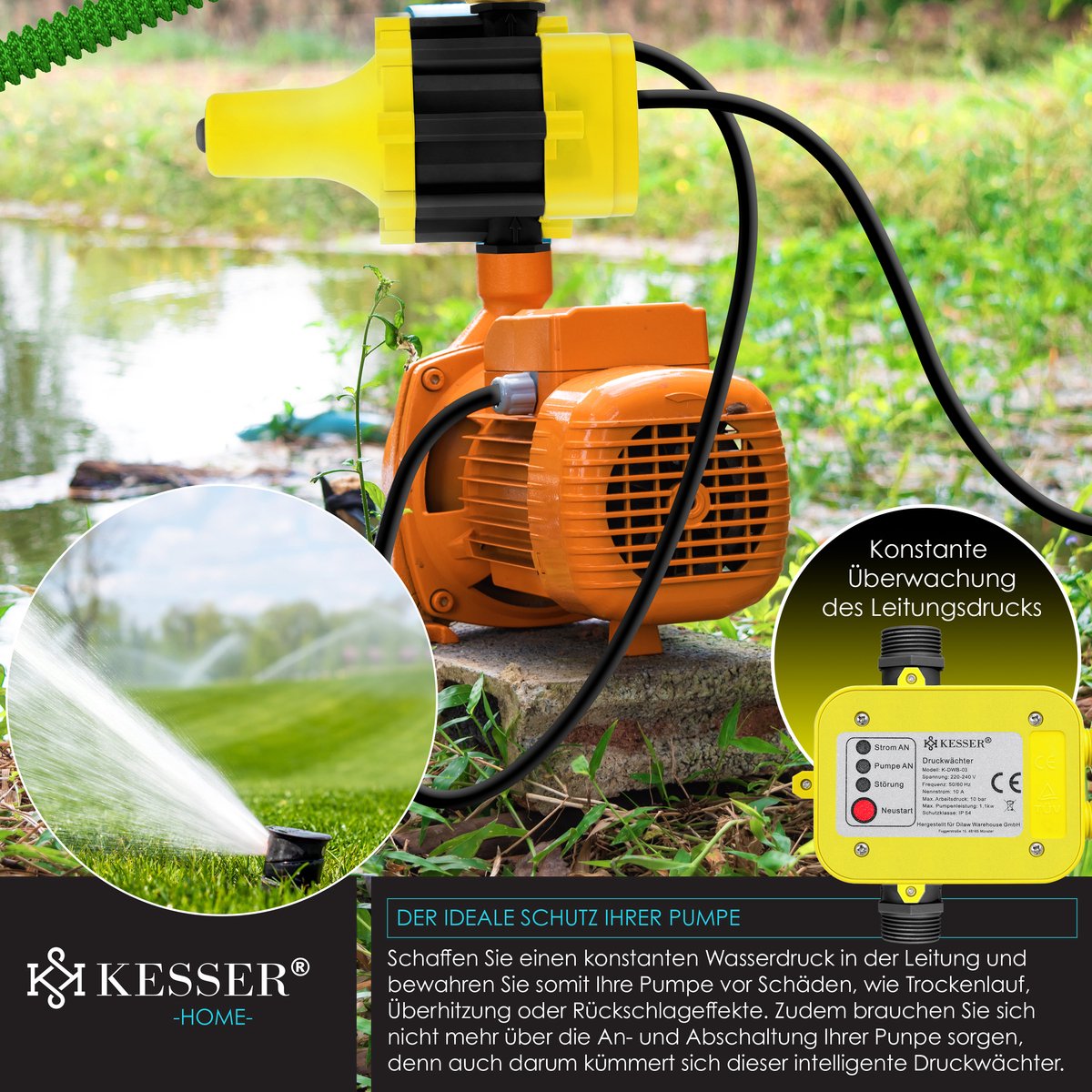 CONSTANTE WATERDRUK: Deze drukschakelaar van KESSER zorgt voor een constante waterdruk voor tuinirrigatie of huishoudelijke watervoorziening.