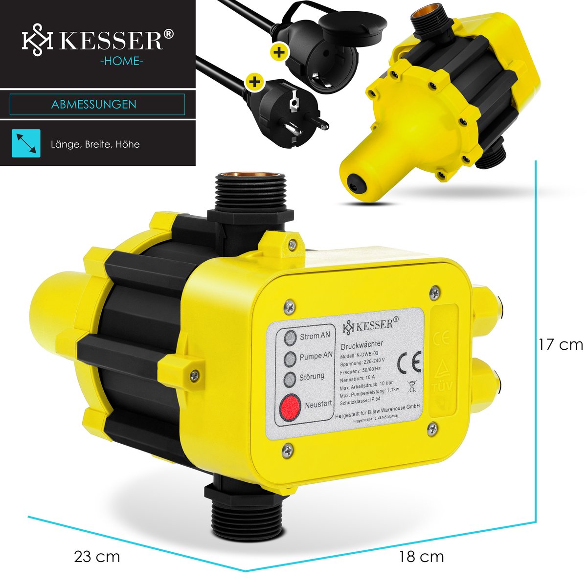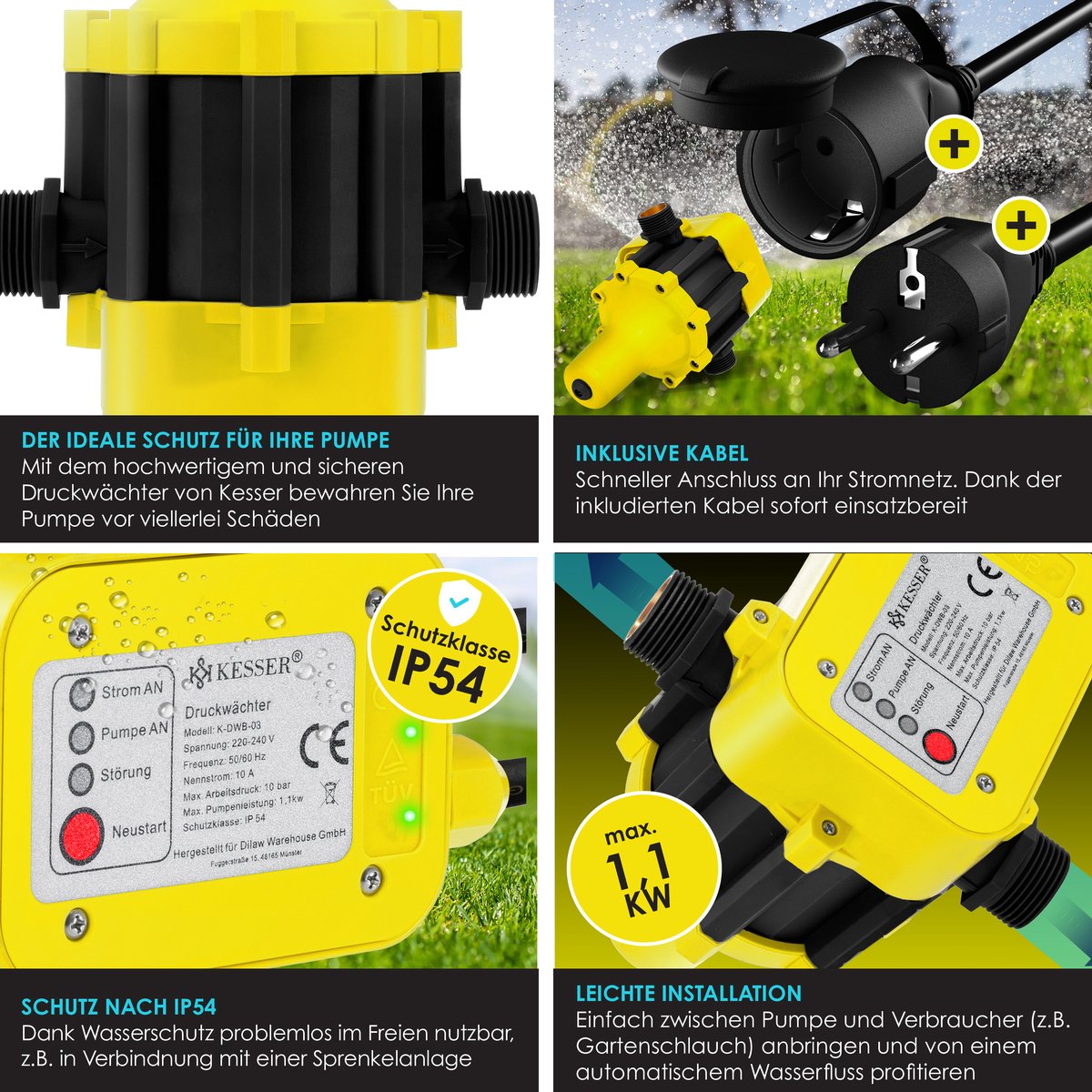 PRODUCTVOORDELEN: Bewaakt de waterdruk , Drukschakelaar met kabel , Zorgt voor een constante waterdruk , Maximale werkdruk: 10 bar