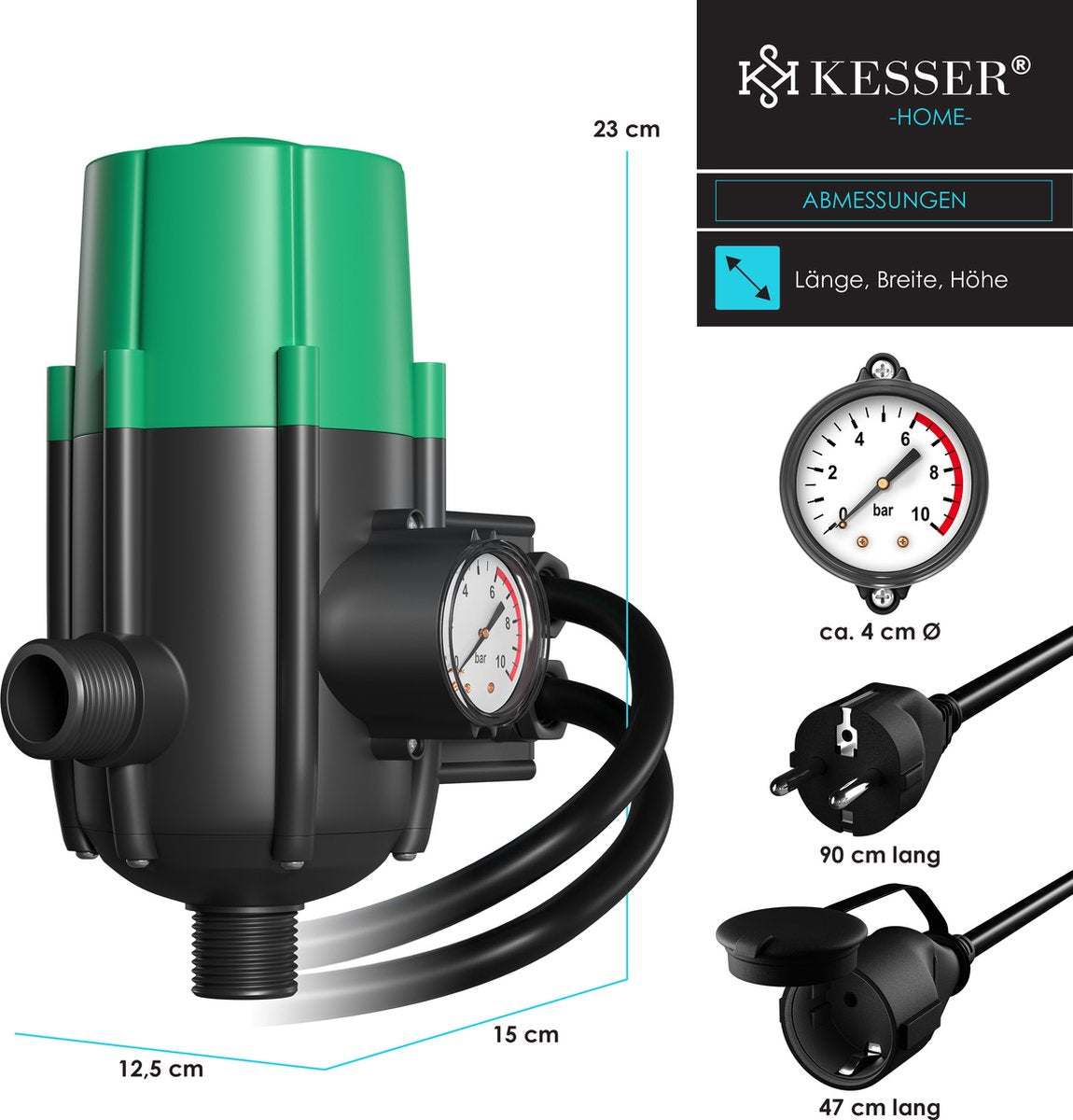 Deze drukschakelaar van KESSER zorgt voor een constante waterdruk voor tuinirrigatie of huishoudelijke watervoorziening. De pompbesturing start en stopt de waterpomp automatisch , afhankelijk van het openen en sluiten van de verbruiker. Dit garandeert een constante druk in het huishoudelijke watersysteem, bij een watertekort treedt een droogloopbeveiliging in werking en stopt de pomp. De pompbesturing elimineert het effect van drukpieken.
