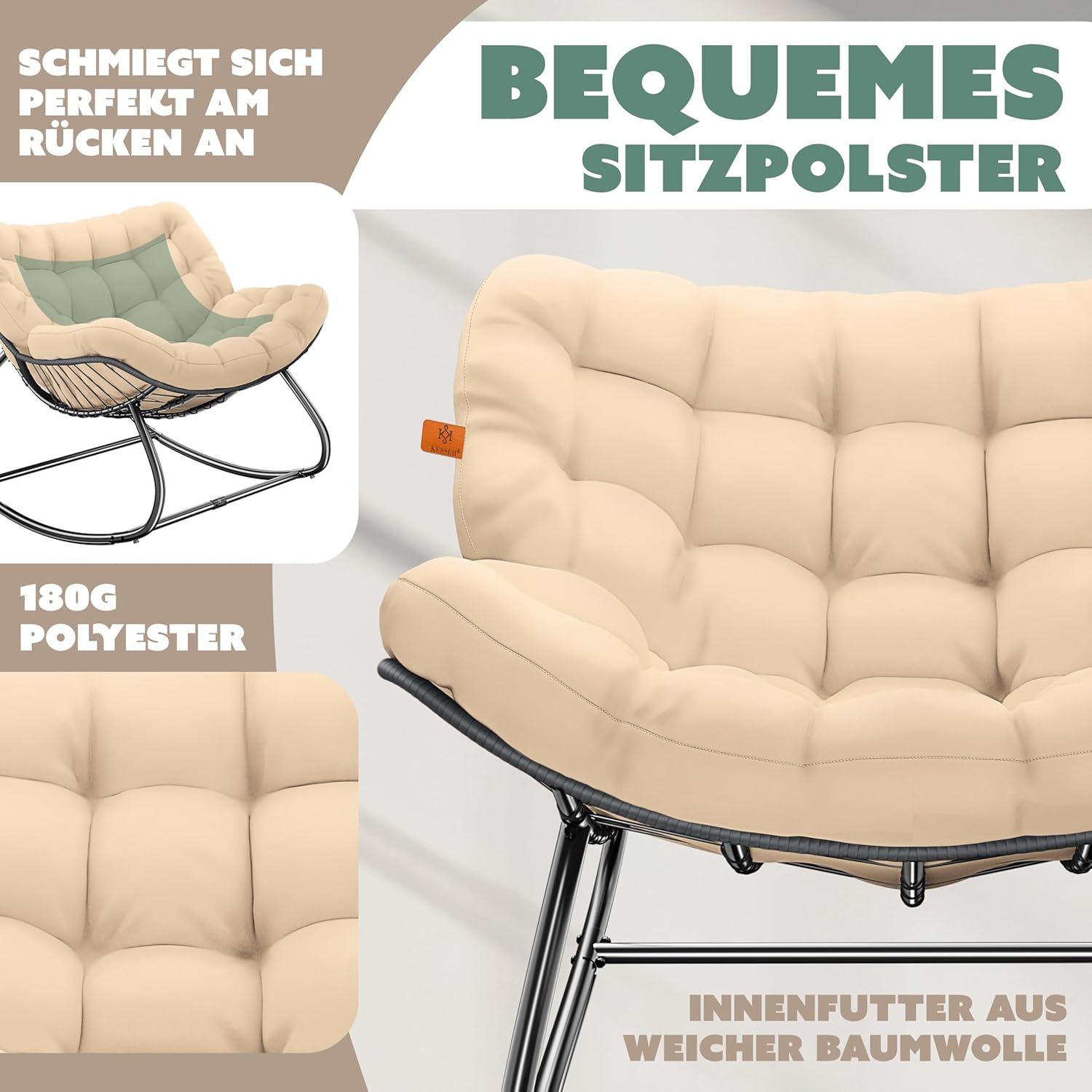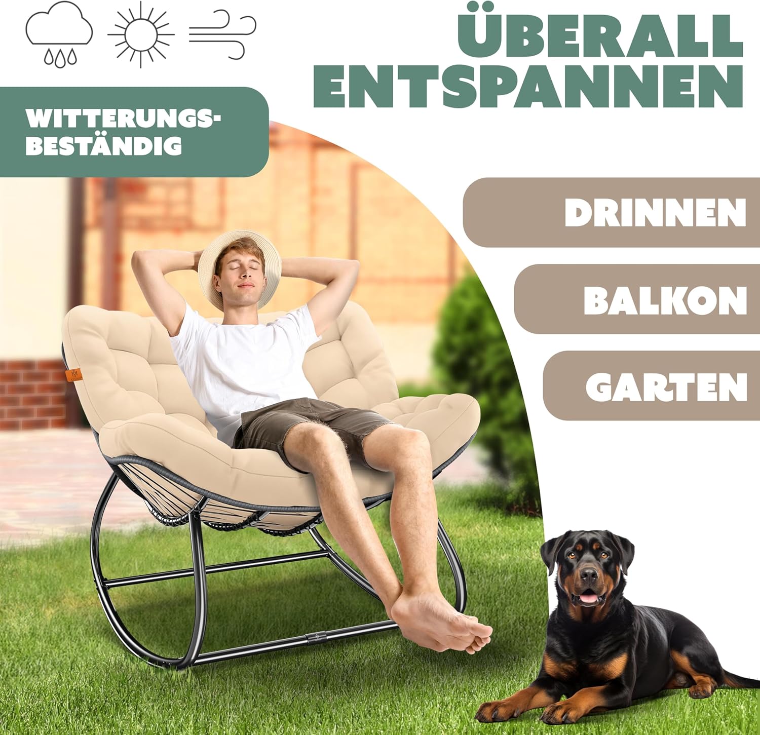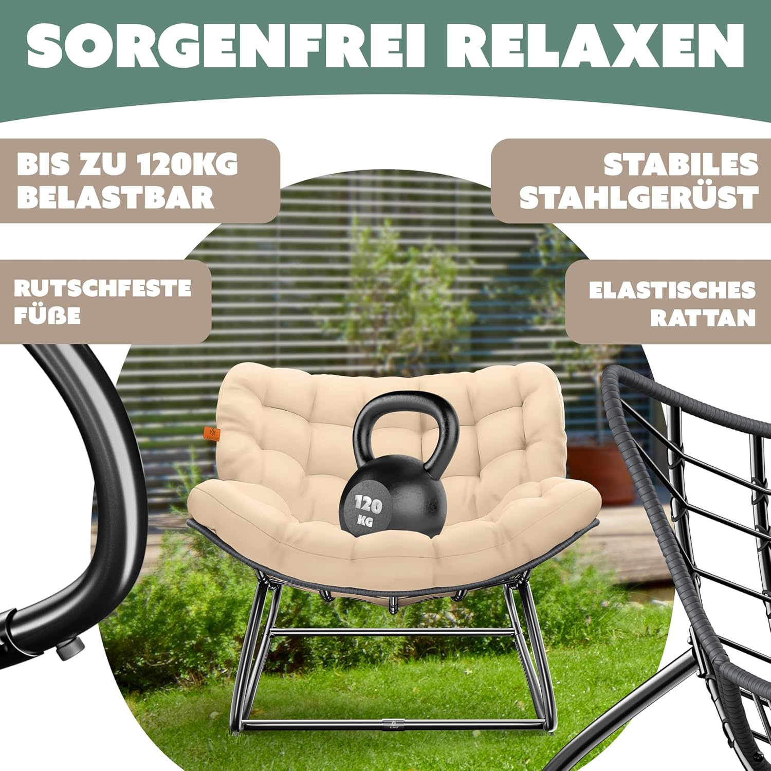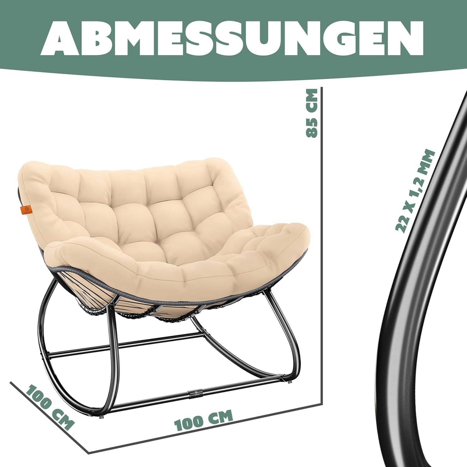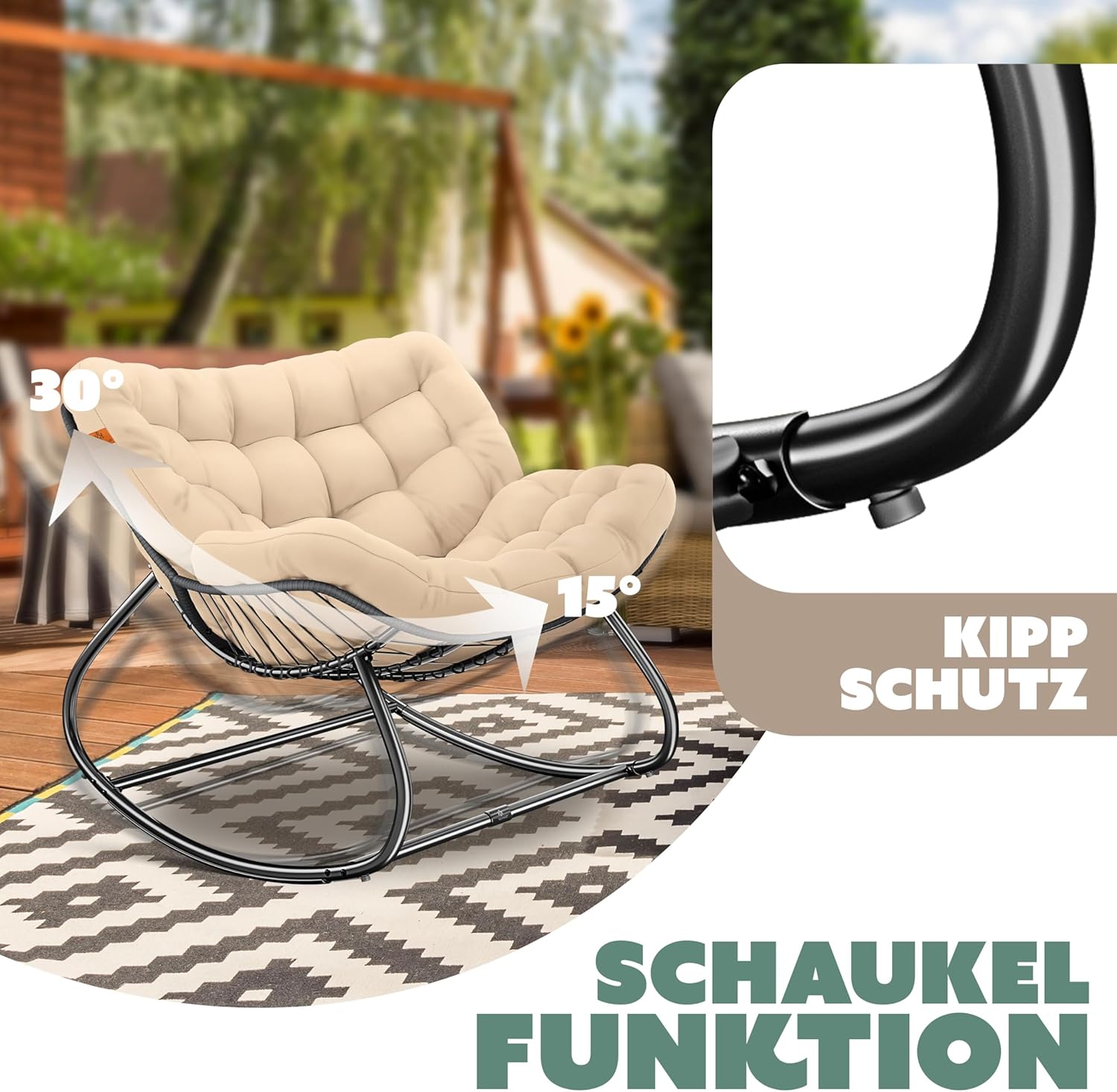 • Veiligheid en stabiliteit: dankzij de antislipvoetjes en het stevige stalen frame kun je veilig en ontspannen achterover leunen. De stoel draagt tot 120 kg gewicht en biedt daardoor maximale veiligheid. De kantelvaste schommelfunctie zorgt voor een rustgevende schommelervaring, terwijl de robuuste materialen voor lange houdbaarheid zorgen.