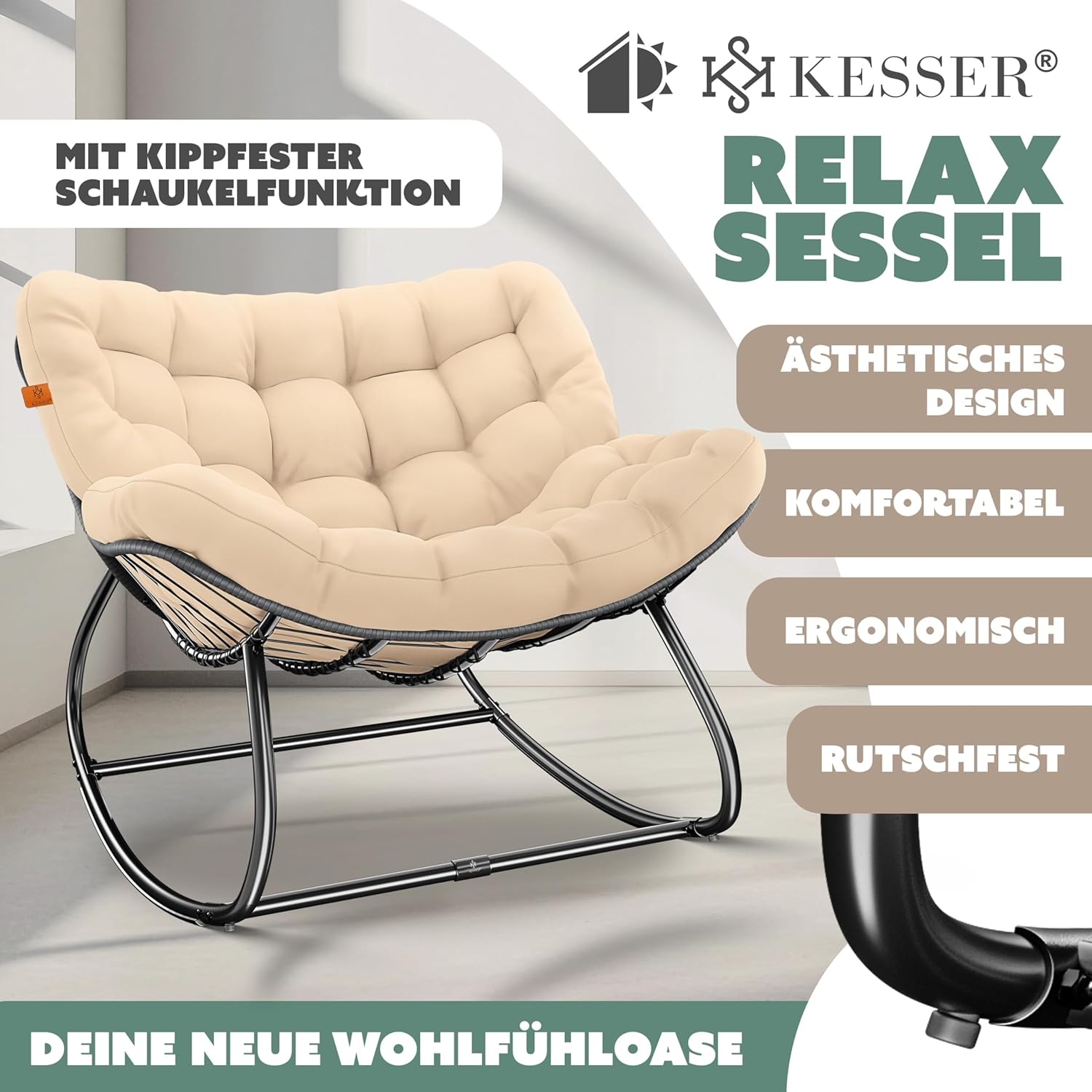 • Extra comfort en stevig: de KESSER Relax XXL Chillexer en XXL Chillexer Pro bieden je maximaal comfort en een esthetisch design dat perfect in elke omgeving past. De ergonomische vormgeving en de kantelvaste schommelfunctie zorgen voor zorgeloos relaxen.
