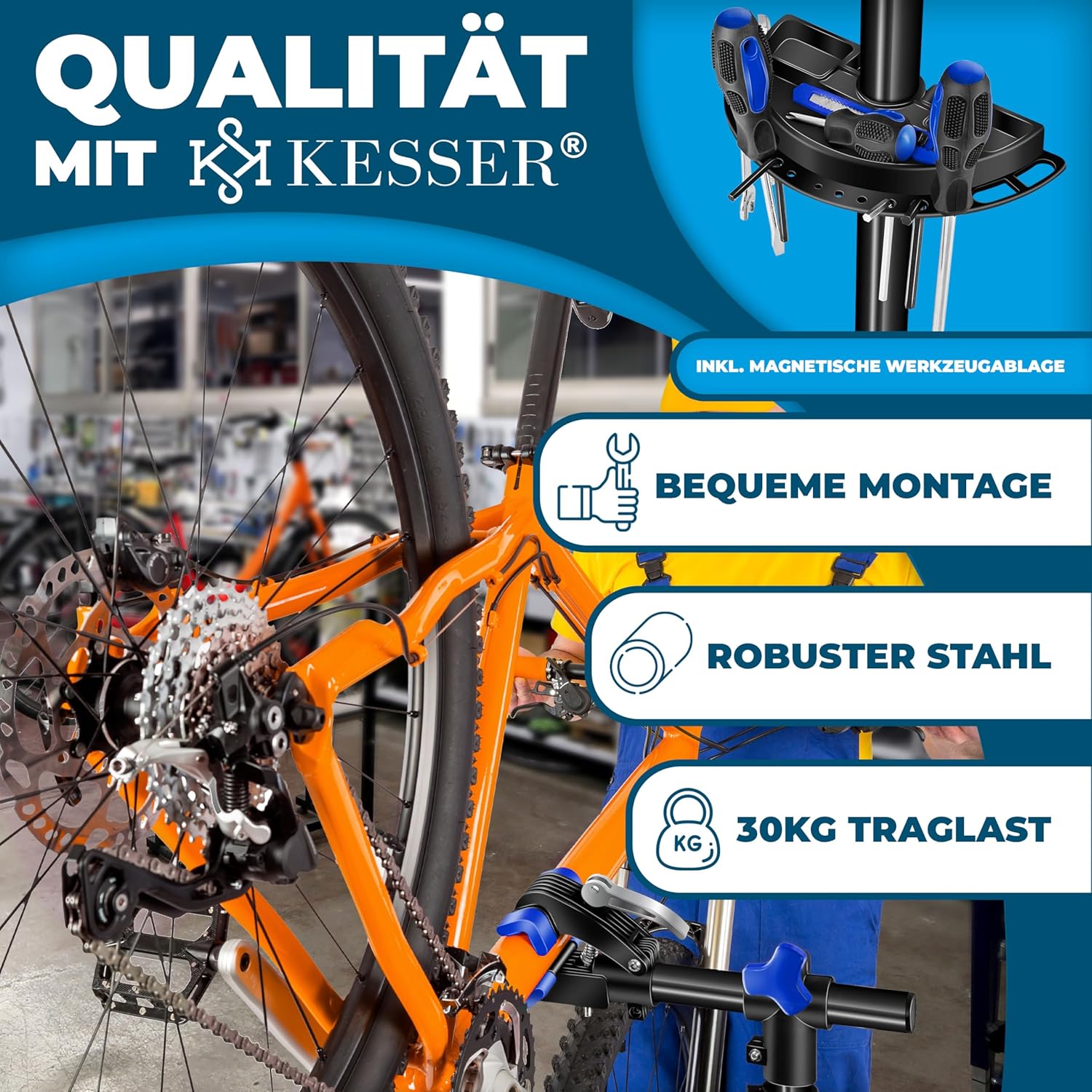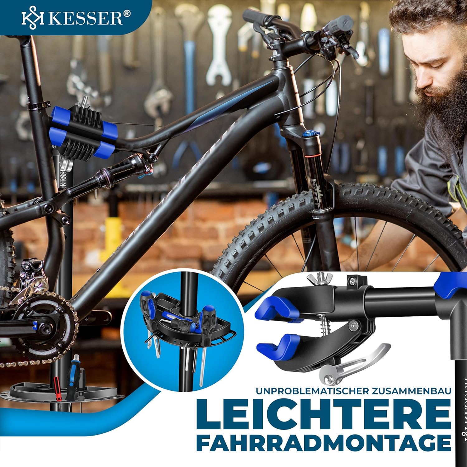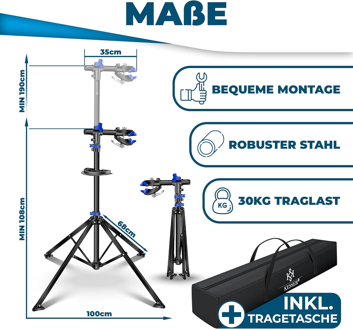 KESSER ruimtebesparende en draagbare fietsmontagestandaard in hoogwaardige en duurzame kwaliteit voor alle framematen met magnetische gereedschapshouder, snelspanner, in hoogte verstelbaar montagestatief en draagtas